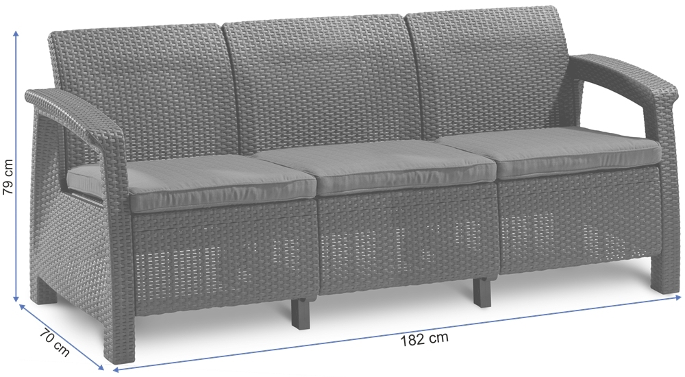 Moderní třímístná pohovka Corfu Love Seat Max je univerzálním vybavením pro zahradu, velký balkón nebo terasu. Je vyroben z polypropylenu, který je velmi odolný vůči povětrnostním vlivům a nevyžaduje žádnou údržbu. Pohovku lze umýt vodou a jemnými čisticími prostředky. Sedadla mají pohodlné polštáře, jejichž povlaky se díky zipu dají jednoduše sundat. Pohovka je navržena tak, aby ji snadno sestavil opravdu každý.