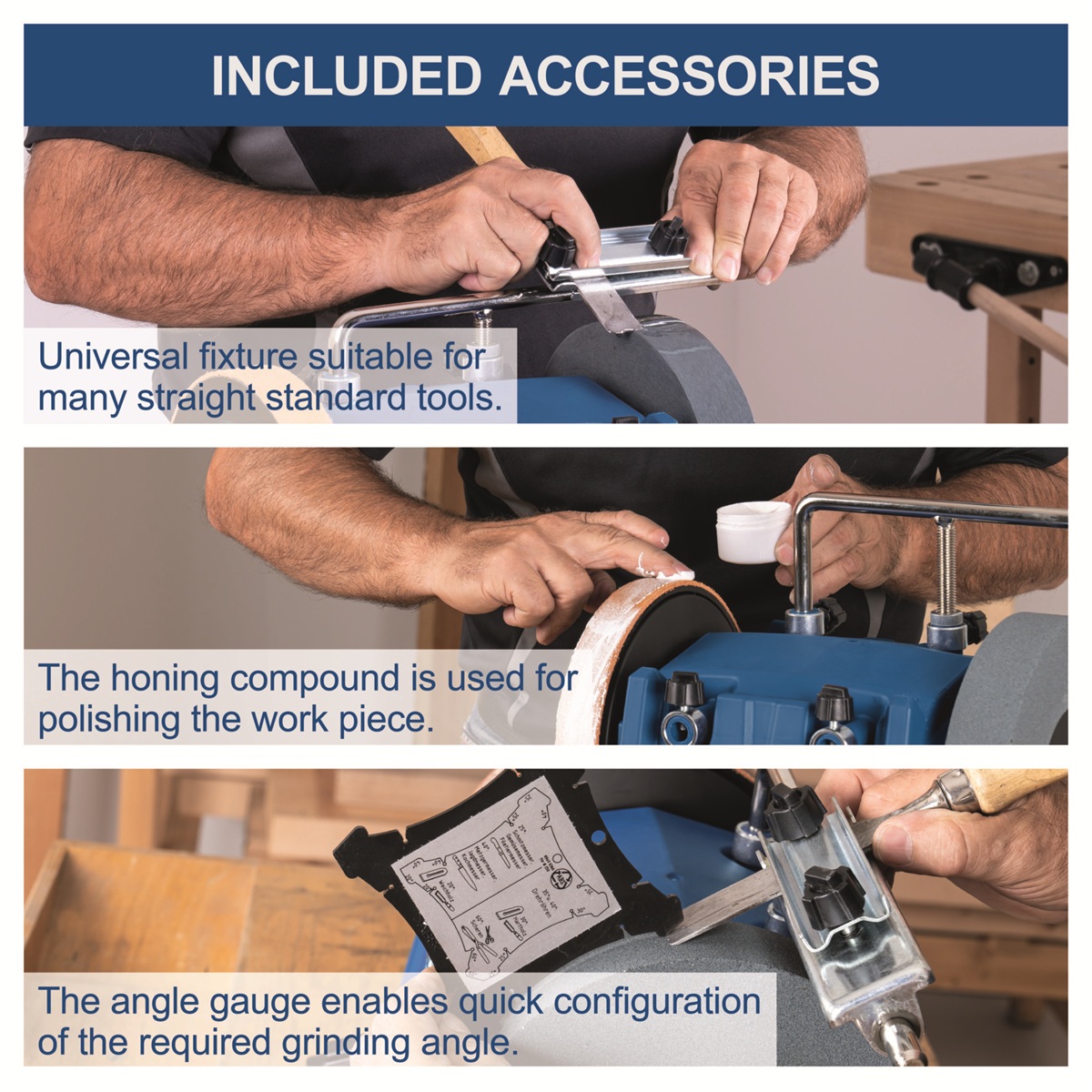 Profesionální brousící systém Scheppach Tiger 7000 S se hodí výborně jak pro domácí dílny, tak i pro menší provozovny a dílny, které vyžadují perfektní ostrost svých nástrojů. Na ovládání brousícího systému Scheppach je skvělé, že díky jednoduchému ovládání a systému přípravků může nástroj dokonale nabrousit i úplný začátečník a uchránit tak mnohdy drahé nástroje před zničením. Základem pro správně nabroušené ostří je speciální široký kámen o průměru 250 mm, který v sobě, pro ještě dokonalejší funkci, obsahuje mikročástice oxidu hliníku. Můžete tak, vedle běžných materiálů, brousit i ostří z tvrdokovu. Pro zahlazení všech mikrootřepů a docílení perfektního výsledku slouží vyměnitelný honovací kožený kotouč. Tělo samotného stroje a uložení kotoučů je velmi stabilní, indukční motor je moderní bezuhlíkové konstrukce, takže je výkonný, bezúdržbový a velmi tichý. Nádoba na vodu je vyrobena z pevného, netříštivého plastu. Stroj je opatřen gumovými nožičkami. Jako standardní příslušenství je dodáván úhloměr, přípravek na broušení rovných ostří a abrazívní pasta. Velké množství dalších přípravků lze potom dle potřeby dokoupit.