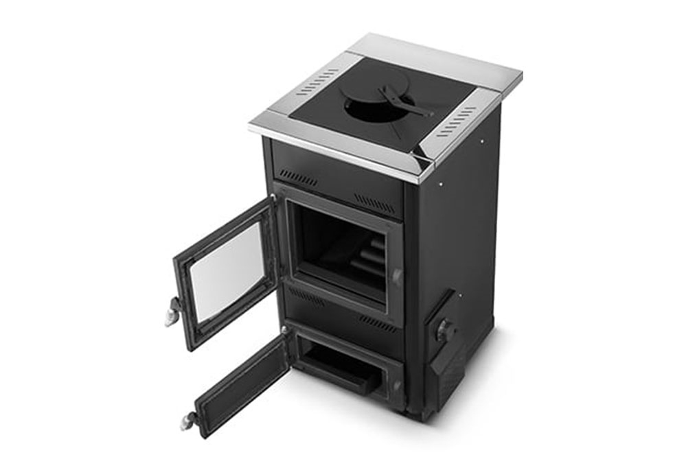 Litinová dvířka i popelník, ocelová varná deska v nerezovém rámu, žáruvzdorný lak sporáku bude tvořit vkusnou součást vybavení domu/bytu.