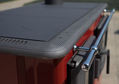 Litinová dvířka i popelník, ocelová varná deska v nerezovém rámu, žáruvzdorný lak sporáku bude tvořit vkusnou součást vybavení domu/bytu.