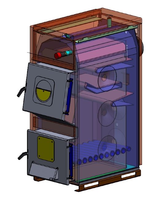 Třítahový kotel na tuhá paliva s ručním přikládáním určený pro spalování dřeva, briket a hnědého uhlí.