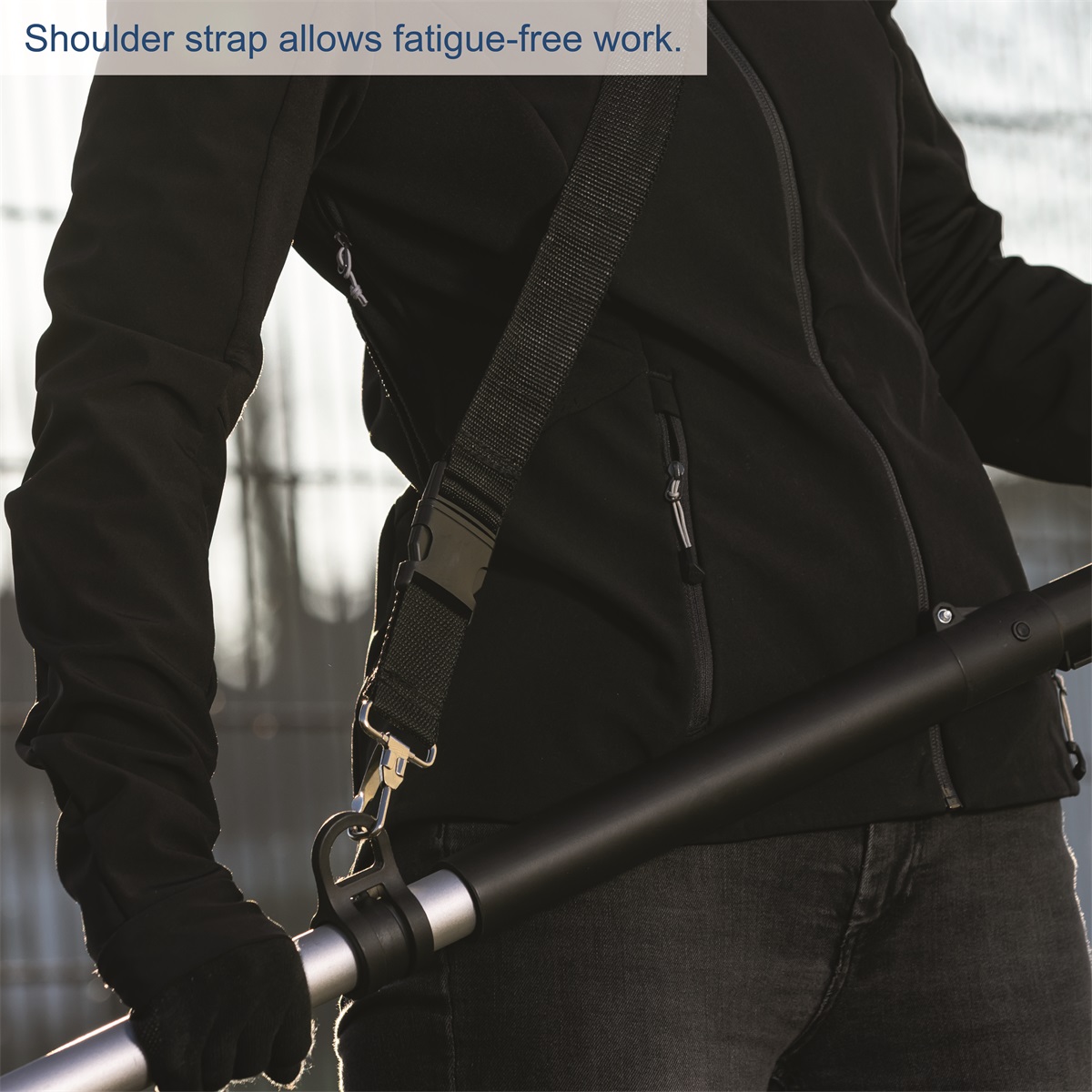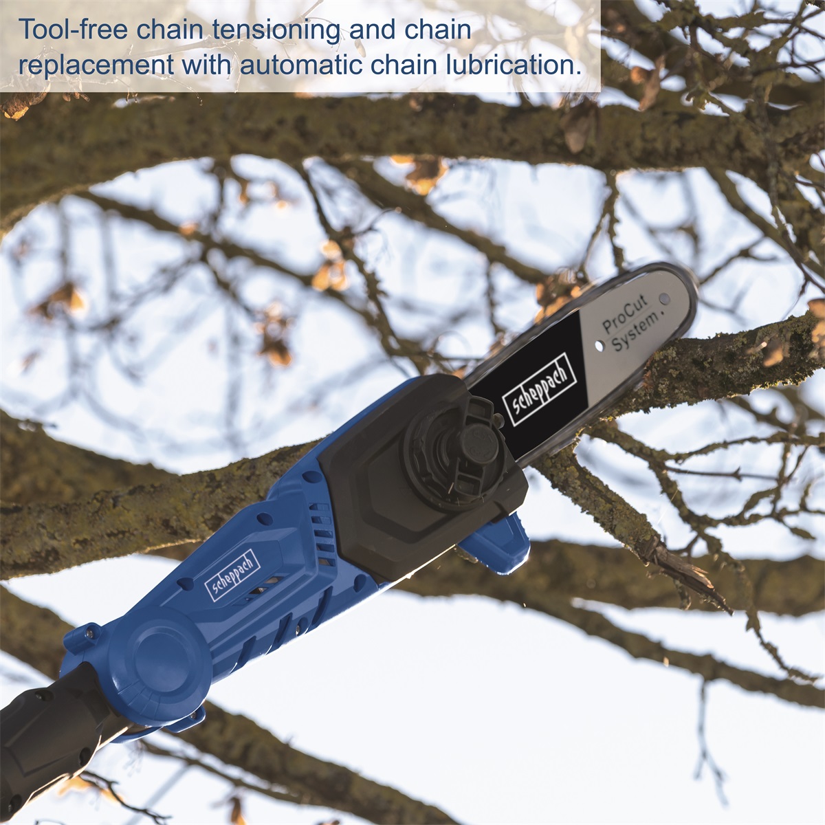 Plotostřih má nastavitelný úhel hlavy v 11 pozicích (90°–240°) a délka řezu 410 mm. Celkový dosah činí až 2,6 m, což umožňuje snadné stříhání i vyšších živých plotů. Prořezávací pila má nastavení úhlu ve 4 pozicích (135°–180°), rychlost řezu 4,5 m/s, délku řezu 180 mm a celkový dosah až 2,35 m. Je ideální pro přesné prořezávání větví. Díky plynule nastavitelnému teleskopickému hliníkovému nástavci lze snadno dosáhnout i na těžko přístupná místa. Bezpečná manipulace je zajištěna protiskluzovou rukojetí s bezpečnostním spínačem, zatímco automatické mazání řetězu a možnost výměny a napnutí řetězu bez nářadí usnadňují údržbu. Ramenní popruh potom zajišťuje pohodlí při práci a snižuje únavu. Stroj se dodává bez baterie a nabíječky.