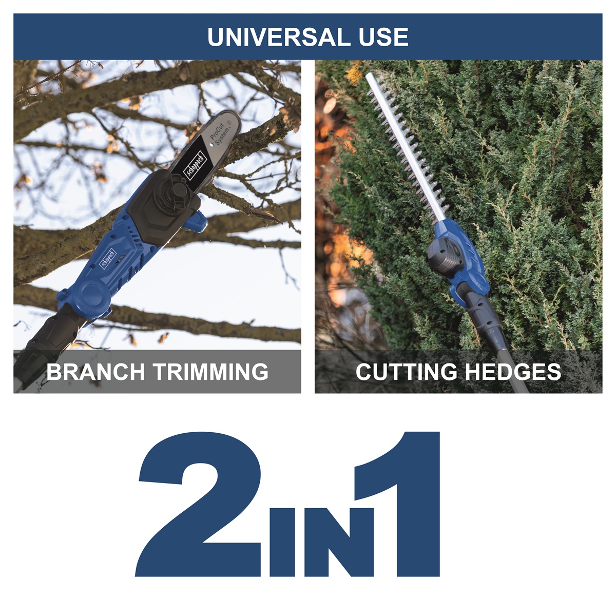 Výkonné akumulátorové multifunkční zařízení Scheppach C-PHTS410-X s funkcí 2v1 je navrženo pro stříhání živých plotů a prořezávání větví, a to i ve větších výškách. Díky své univerzálnosti a možnosti nastavení je ideální volbou pro práci na zahradě, která vyžaduje přístup i do těžko dostupných míst.