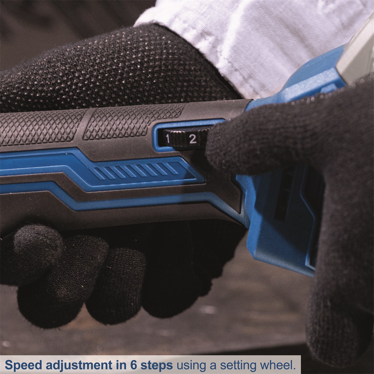 Bruska umožňuje nastavení otáček v šesti stupních v rozsahu 2 500 až 10 000 ot/min, což zaručuje přesné přizpůsobení danému materiálu a aplikaci. Přední rukojeť lze nastavit do tří poloh a je vybavena integrovaným držákem na montážní klíč, což zvyšuje komfort a rychlost při výměně kotouče. Snadnou výměnu nástroje zajišťuje praktická aretace vřetene. Model disponuje standardním upínáním M14 a je určen pro kotouče s průměrem 125 mm. Stroj se dodává bez baterie a nabíječky.