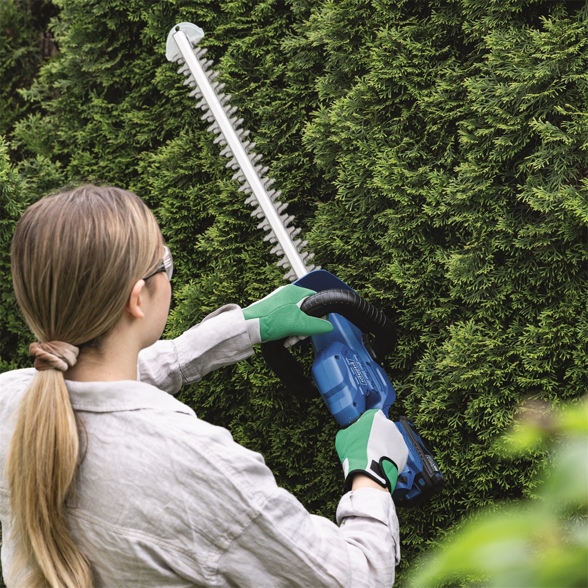 Nůžky jsou vybaveny výkonnou čepelí o délce 560 mm, která nabízí 2400 střihů za minutu a umožňuje tak přesný střih až do délky 510 mm. Jsou vhodné pro větve do průměru 16 mm, což z nich činí ideální nástroj pro pravidelnou údržbu zahrady. Ergonomické rukojeti s měkkým povrchem zaručují pohodlné držení a snadnou manipulaci. Součástí balení je ochranný kryt na lištu, který usnadňuje bezpečné skladování. Navíc mají nůžky integrovaný držák pro zavěšení na zeď, takže se dobře skladují. Tyto akumulátorové nůžky na živý plot vám usnadní zahradní práce a zaručí skvělé výsledky při minimálním úsilí. Stroj se dodává bez baterie a nabíječky.