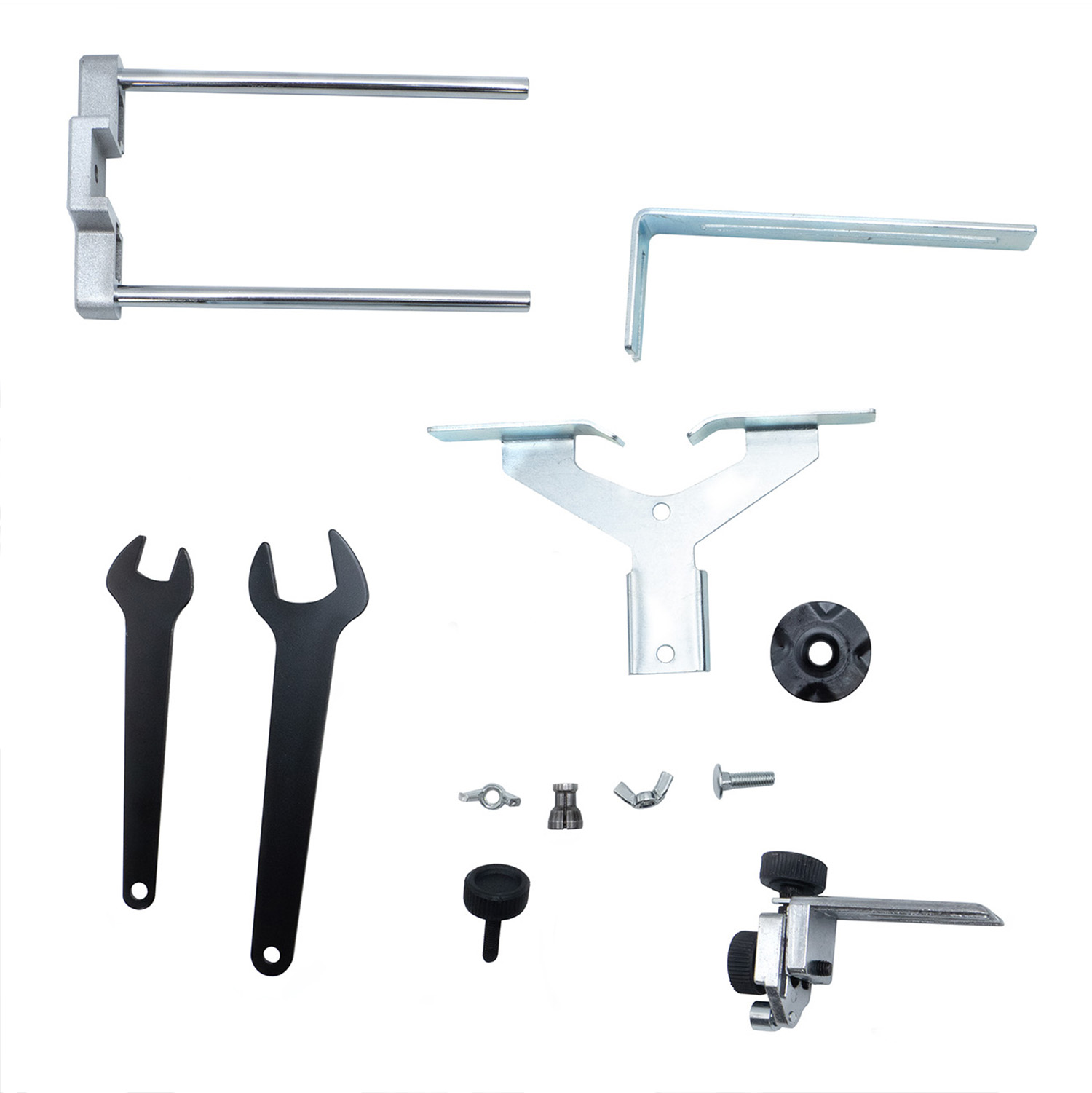 Mnohostranné základny a příslušenství: Obsahuje tři různé základny (frézovací, šikmou a ponornou), paralelní doraz, kopírovací kroužky a vodicí váleček, což výrazně rozšiřuje možnosti použití pro různé frézovací techniky a tvary.