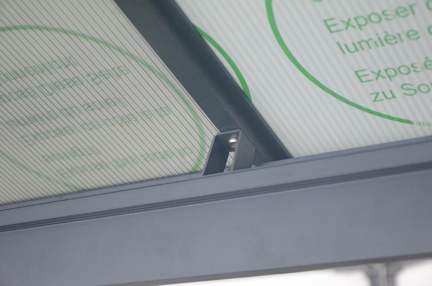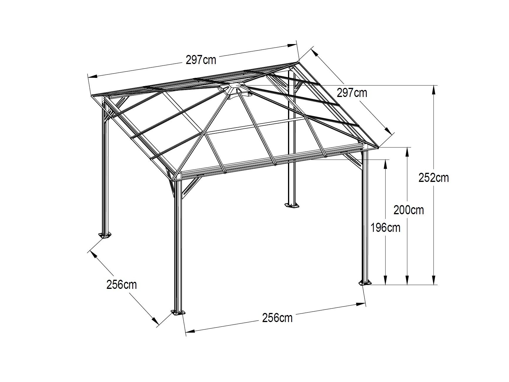 Zahradní hliníkový altán LANITPLAST 33 poskytuje potřebný stín pro posezení na zahradě. Nejedná se o běžný lehký altán s trubkovou skládací konstrukcí (jako je běžně ke koupi v hobbymarketech), ale o masivní výrobek zhotovený ze silných vzájemně sešroubovaných hliníkových profilů (síla 1,0 mm) určený k pevné montáži k zemi pomocí patek. Hliníkové profily jsou ochráněny práškovou vypalovací barvou v tmavě šedém odstínu - antracit. Spojky jednotlivých profilů jsou vyrobené z lakovaného pozinkovaného ocelového plechu 1,5 mm. Z důvodu zajištění maximální kvality je výhradně použit kvalitní polykarbonát MARLON (výrobce Brett Martin Velká Británie), který v ČR prošel náročnými testy ve státem akreditovaných zkušebnách jako stavební materiál. Smluvní prodloužená záruka 10 let na nerozbitnost polykarbonátu krupobitím je u produktů od LANIT PLASTU samozřejmostí. Střecha tohoto modelu altánu je vyrobena z čirého komůrkového polykarbonátu 6 mm.