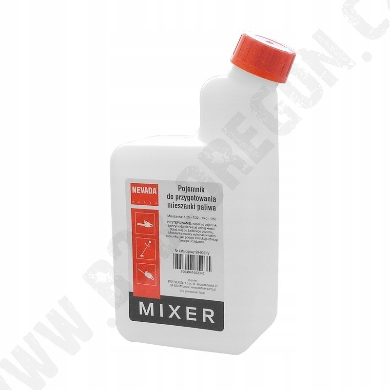 Průhledná láhev pro jednoduché plnění kapalin. Oleoznak pro přesné dávkování oleje dle správného poměru. Oranžový nepropustný šroubovací uzávěr.