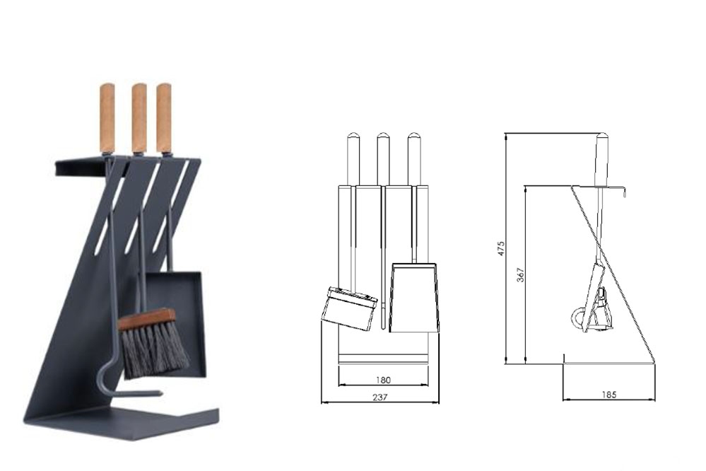 Sada nářadí pro krby a krbová kamna obsahující pohrabáč, lopatku a košťátko.