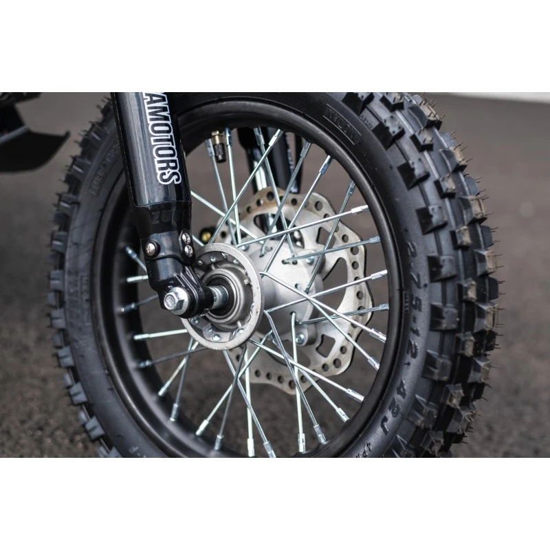 Bezpečnost je prioritou, a proto je Spirit 90 vybaven hydraulickými kotoučovými brzdami na předních i zadních kolech, které zaručují spolehlivý brzdný výkon v každém terénu. O stabilitu a komfort během jízdy se starají hydraulické upside-down vidlice na přední straně a zadní centrální tlumič (monoshock), který přináší vyvážený a pohodlný zážitek i na nerovném povrchu. Díky kombinaci 12" předního a 10" zadního kola s off-roadovými pneumatikami na vypletených ráfkách je Spirit 90 připraven zvládnout jakýkoli terén, od lesních stezek po hliněné dráhy. Tento model je navíc postaven na robustním ocelovém rámu, což zajišťuje jeho odolnost a dlouhou životnost. Leramotors Spirit 90 12/10 je ideálním pitbikem pro malé děti, které chtějí začít svou motokrosovou cestu s bezpečným a spolehlivým strojem.