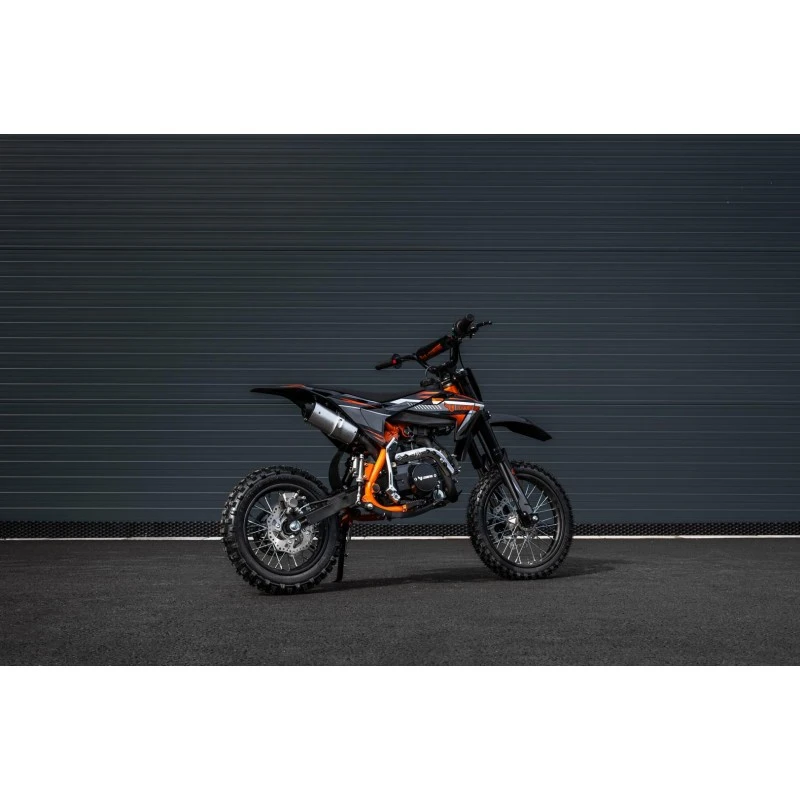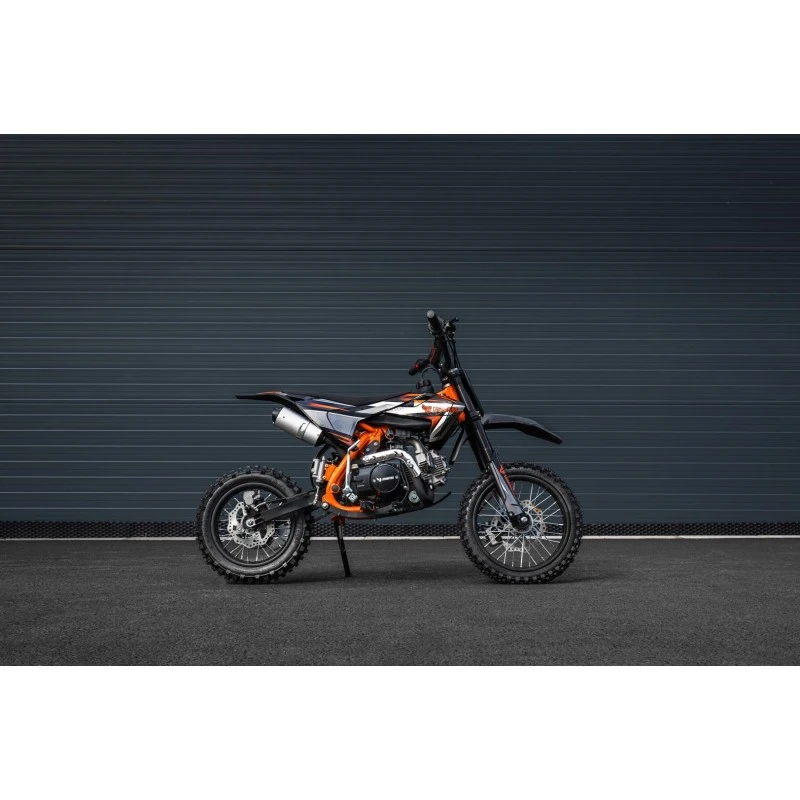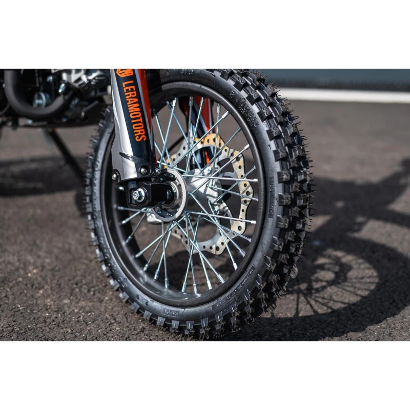 Dětská benzínová motorka pitbike Leramotors Cannon 125ccm 4T 14/12 E-Start s motorem o objemu 125 ccm a výkonem 8 kW poskytuje ideální kombinaci síly a spolehlivosti jak pro zkušenější zapálené bikery, tak i pro začínající motorkáře. Jednoválcový, 4-taktní motor je chlazen vzduchem, což zajišťuje efektivní provoz i v náročnějších podmínkách. Díky nožnímu i elektrickému startování je motorka snadno ovladatelná, ať už v terénu, nebo při klidné jízdě. Elektronické zapalování C.D.I. zajišťuje rychlý start a stabilní provoz.