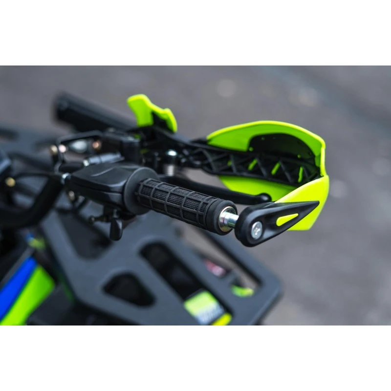 Kryty rukou na čtyřkolce Leramotors By APOLLO RFZ 250 poskytují jezdci spolehlivou ochranu a pohodlí při jízdě v náročných podmínkách. Tyto pevné kryty efektivně chrání ruce před větvemi, kamínky, blátem a dalšími nečistotami, které by mohly během jízdy způsobit nepříjemnosti. Zároveň zvyšují bezpečnost a dodávají pocit jistoty při průjezdu hustým terénem nebo na nezpevněných cestách. Kromě ochrany před přírodními překážkami také napomáhají zvyšovat komfort při jízdě v chladnějším počasí, protože snižují přímý nápor větru na ruce. Díky krytům rukou tak bude každý výlet nejen bezpečnější, ale také pohodlnější.