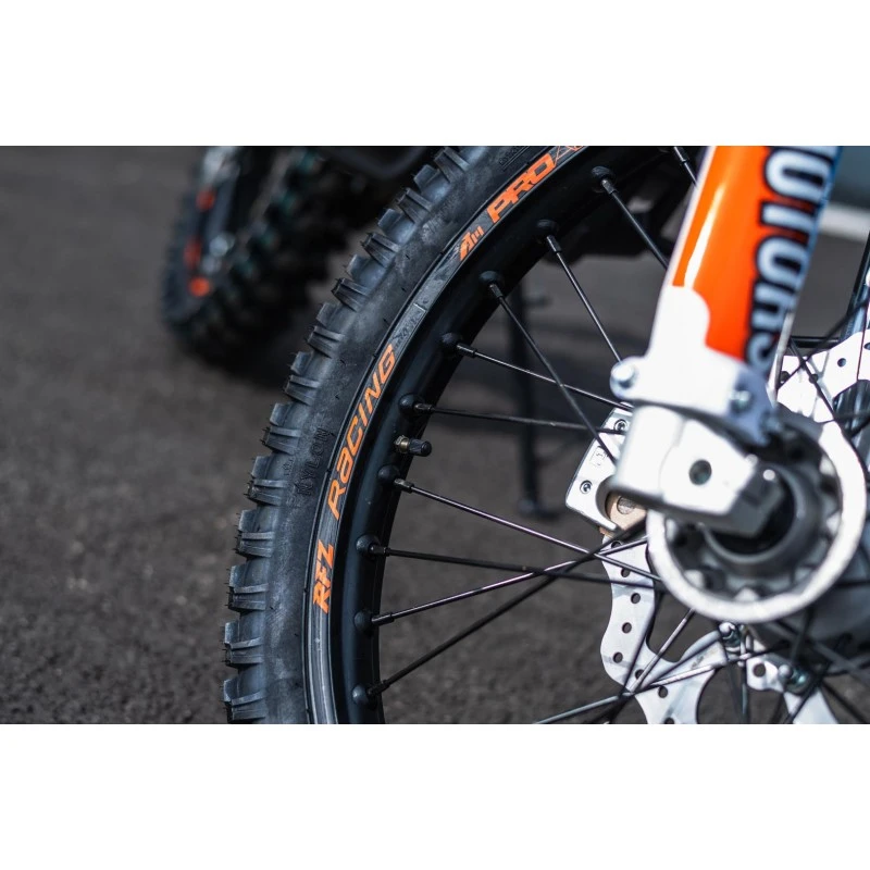Tato motorka je postavena na pevných 21" ráfcích vpředu a 18" ráfcích vzadu, osazených předními pneumatikami 80/100-21 a zadními 100/90-18, které poskytují vynikající trakci a stabilitu na nezpevněných cestách. Díky robustnímu podvozku a olejovým předním tlumičům je jízda hladká i v náročném terénu, zatímco centrální zadní odpružení zajišťuje maximální komfort a kontrolu. Výsledkem je výjimečný jízdní zážitek na jakémkoliv povrchu.