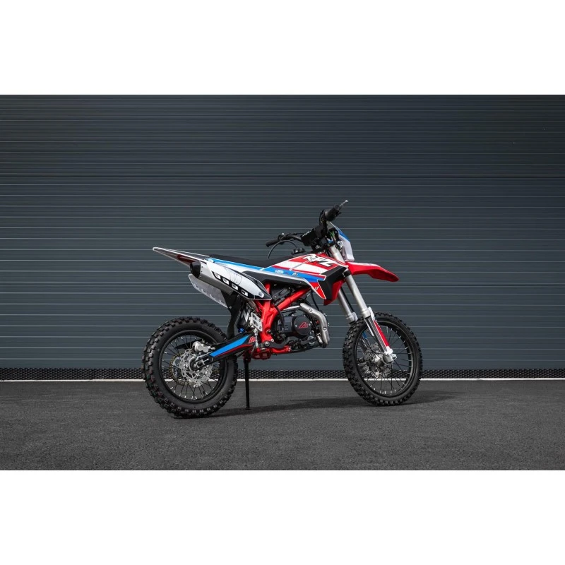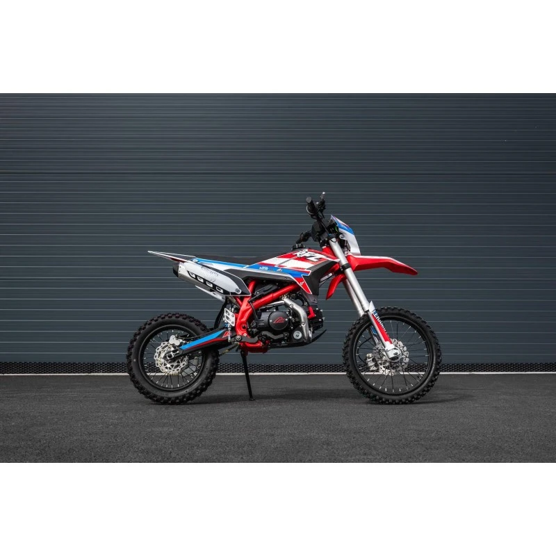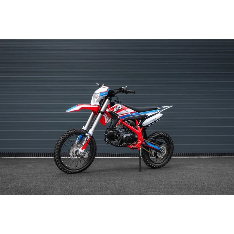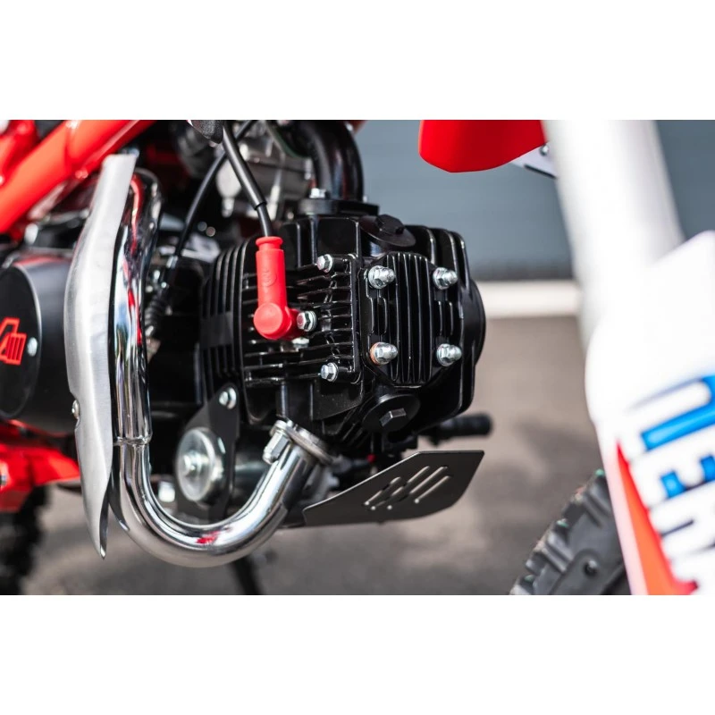 Manuální řazení se čtyřmi rychlostmi umožňuje jezdcům maximálně využít výkon motorky v různých jízdních podmínkách. Díky trubkovému rámu z vysokopevnostní lakované oceli je motorka extrémně odolná, což zajišťuje bezpečí i při náročném zacházení v terénu. Přední 17" a zadní 14" off-road pneumatiky poskytují vynikající trakci a stabilitu na nezpevněných cestách a v terénu. Olejové upside-down tlumiče a centrální zadní odpružení s nastavitelnou tuhostí zaručují plynulou a pohodlnou jízdu i na nerovném povrchu.