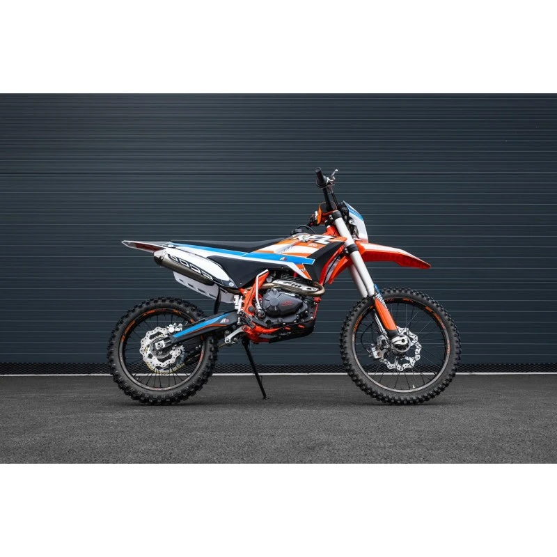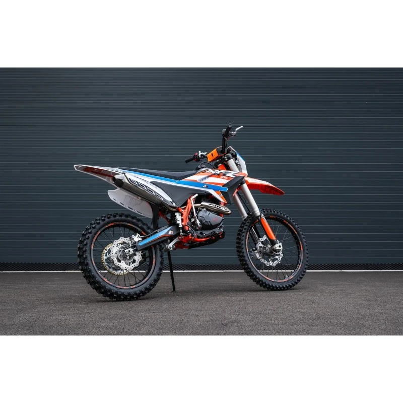 Startování je zajištěno jak elektrickým startérem, tak nožním startem, což poskytuje jezdcům flexibilitu a jistotu, že motorku snadno nastartují za každých podmínek. Konstrukce motorky je založena na trubkovém rámu z vysokopevnostní oceli, který zaručuje mimořádnou odolnost a tuhost, což je klíčové pro jízdu v extrémním terénu. Přední pneumatiky 80/100-21 a zadní pneumatiky 100/90-18 na robustních ráfcích 21” a 18” poskytují výbornou přilnavost a stabilitu na nezpevněných cestách a v bahnitých podmínkách, což zvyšuje bezpečnost a ovladatelnost motorky.