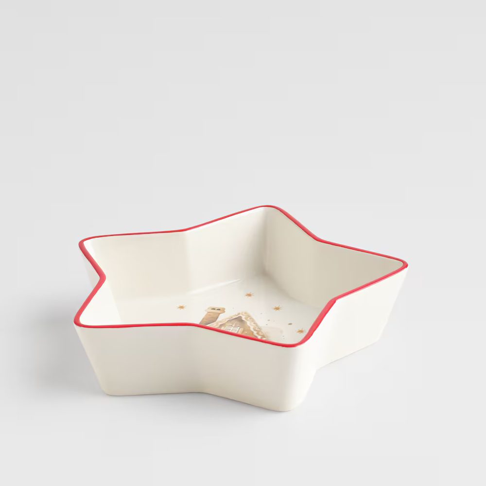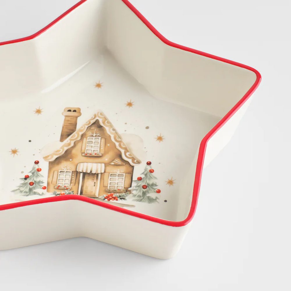 Rozměry: průměr 25 x V 6 cm Materiál: dolomit Další informace: Nevhodné do myčky nádobí a mikrovlnné trouby. Tato keramická mísa ve tvaru hvězdy s červeným okrajem a pohádkovou zimní chaloupkou uprostřed vytváří skutečnou vánoční atmosféru. Díky zasněžené střeše, ozdobným borovicím a zlatým hvězdám na bohatě propracované ilustraci je ideální volbou pro drobné pečivo, dekorace nebo útulné sváteční servírování.