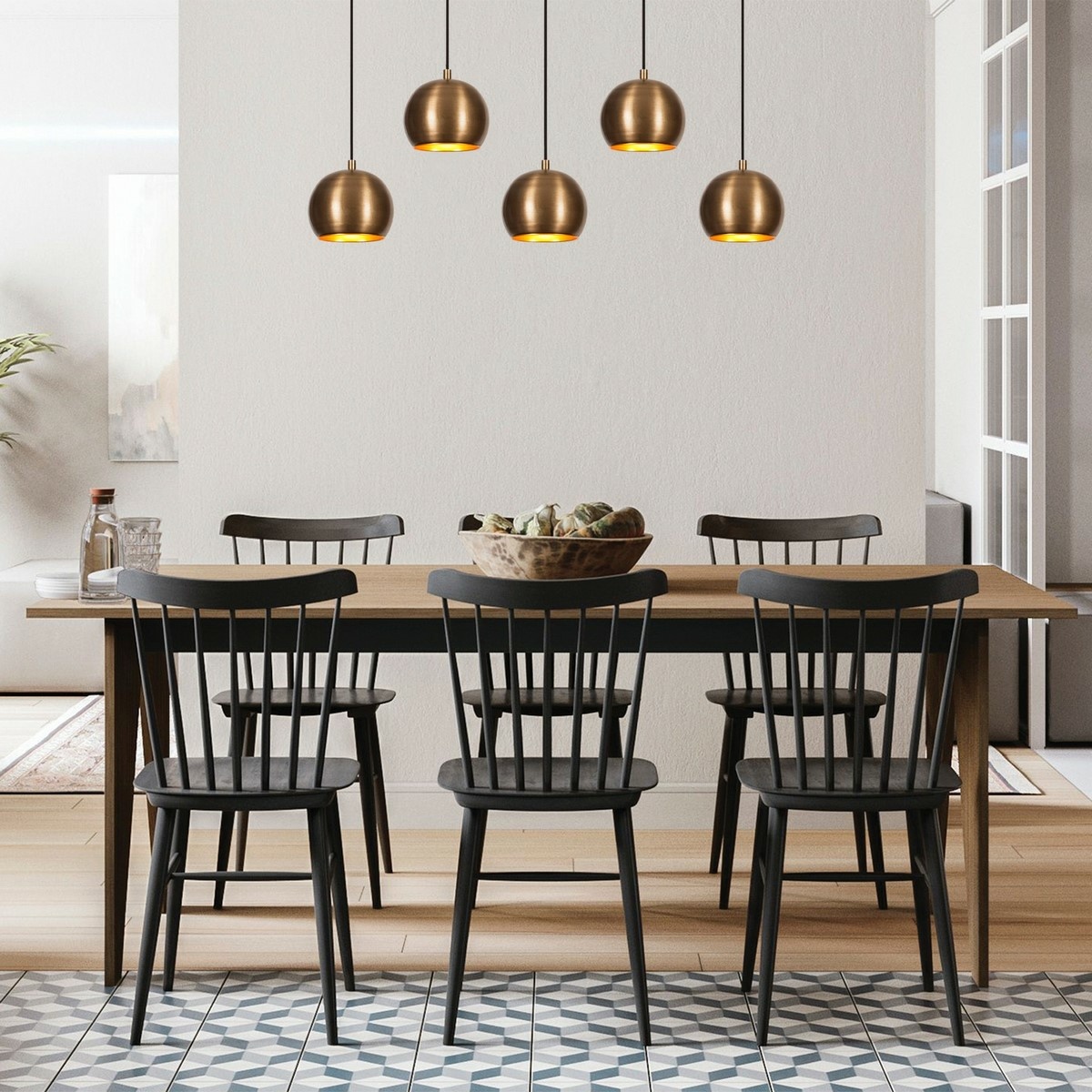 Tento závěsný lustr s pěti světly v elegantním kovovém provedení nabízí stylové a rovnoměrné osvětlení nad jídelní stůl, do kuchyně či obývacího pokoje. Tělo svítidla je z pevného kovu a doplněno pěticí stínidel ve tvaru polokoule s luxusním kartáčovaným povrchem v odstínu zlaté bronzové. Kombinace minimalistického designu a prémiových materiálů zajišťuje, že lustr působí jak dekorativně, tak funkčně.Díky rozměrům 85 x 15 cm se tento model skvěle hodí nad delší jídelní stůl nebo barový pult. Každé ze stínidel má průměr 15 cm a stejnou výšku, tedy 15 cm. Celková výška lustru je 108 cm, přičemž kabely jsou dostatečně dlouhé pro přizpůsobení výšky podle potřeby. Patice typu E27 umožňuje snadné osazení běžně dostupnými žárovkami o maximálním příkonu 40 W (žárovky nejsou součástí balení).Svítidlo je určeno pouze pro vnitřní použití a má krytí IP20, což znamená, že je chráněno proti vniknutí pevných předmětů větších než 12,5 mm, ale nikoli proti vodě. Skvěle zapadne do moderních i industriálních interiérů a jeho zlatý tón navodí příjemnou atmosféru.Hlavní výhody produktu: atraktivní pětiramenný design pro rovnoměrné osvětlení elegantní kovová konstrukce s kartáčovaným povrchem možnost použití různých typů E27 žárovek ideální nad jídelní stůl, bar či do obýváku vnitřní použití s krytím IP20Obsah balení: 1x závěsný lustr s pěti stínidly 1x montážní sadaParametry a specifikace: materiál: kov barva: zlatá bronzová rozměry těla: 85 x 15 cm výška: 108 cm průměr stínidla: 15 cm výška stínidla: 15 cm typ objímky: 5x E27 max 40 W krytí: IP20 žárovky: nejsou součástí balení