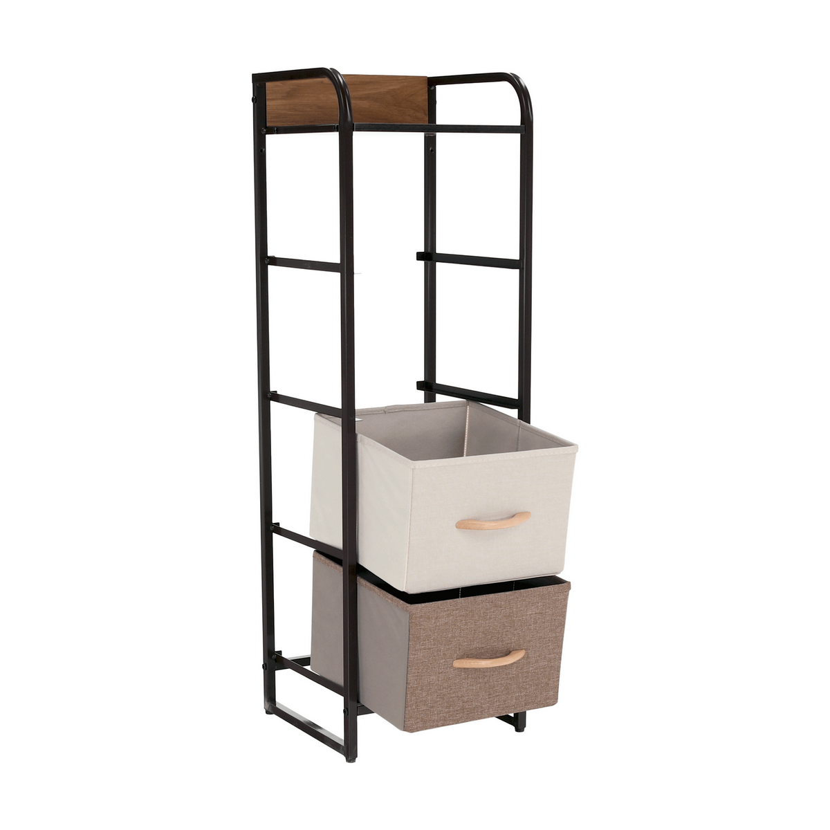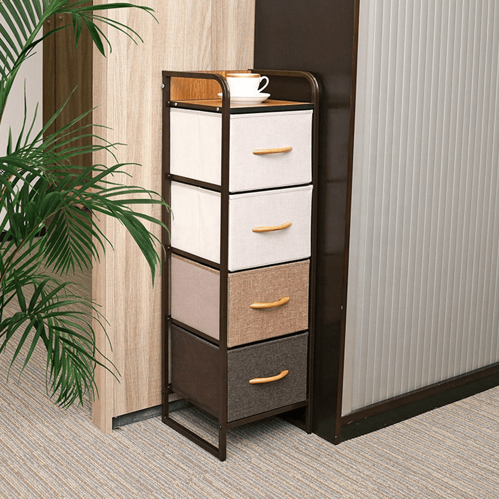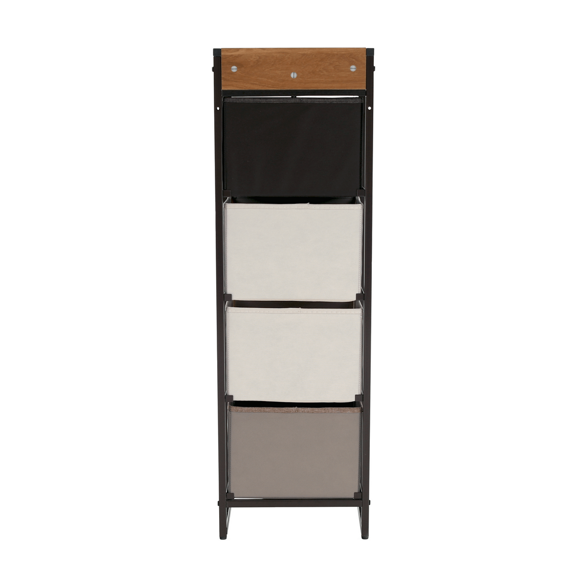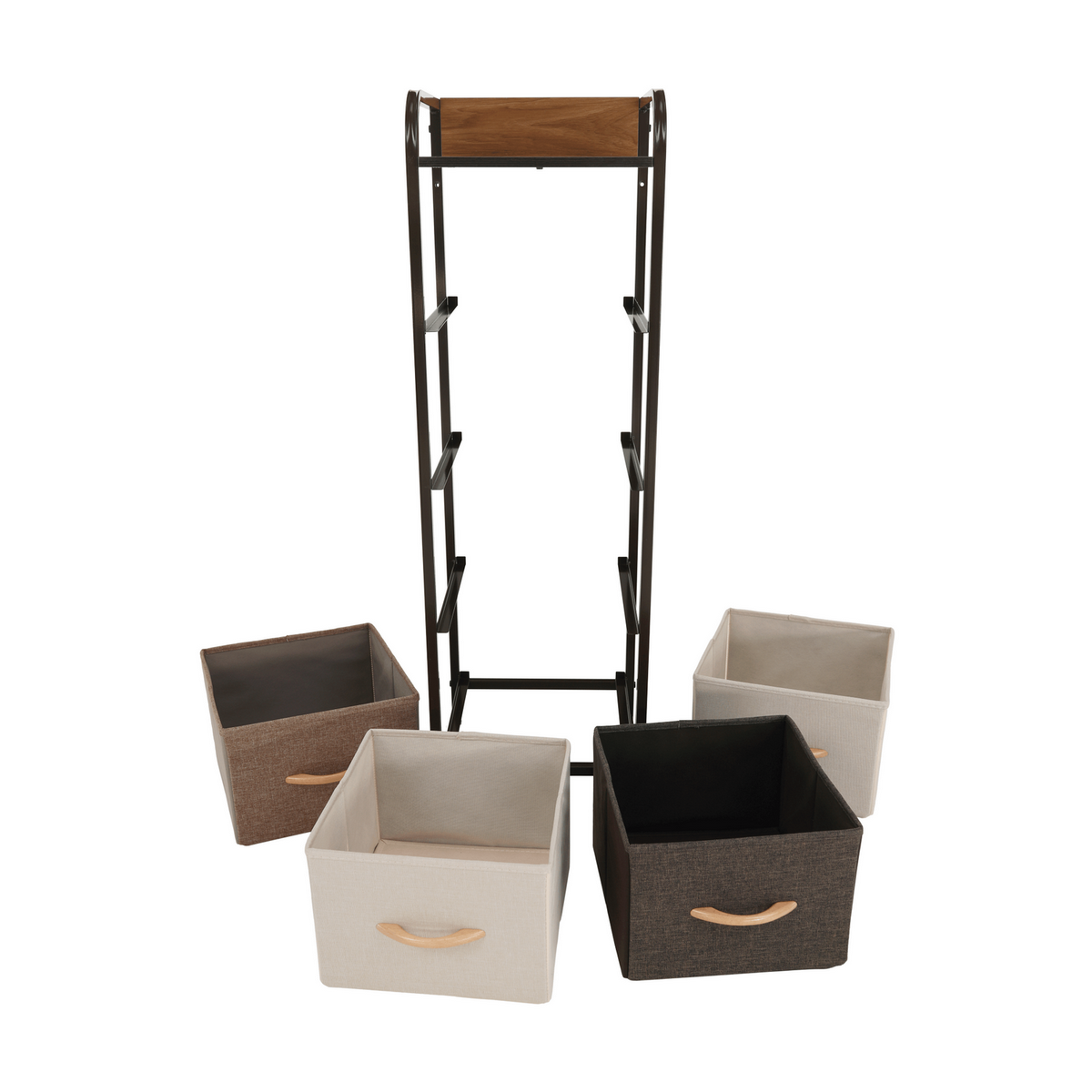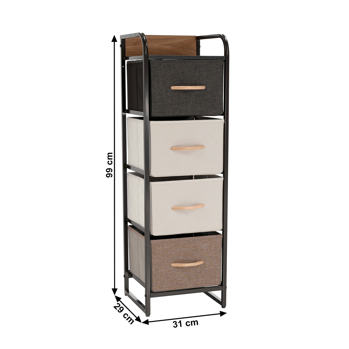 Komoda s látkovými šuplíky HAZEL TYP 1 v hnědém provedení je praktické a lehké úložné řešení vhodné do obývacího pokoje, ložnice i dětského koutku. Stabilní kovová konstrukce doplněná o dřevěné prvky a čtyři textilní zásuvky v příjemných odstínech béžové, světle hnědé a tmavě hnědé vytváří moderní a zároveň útulný vzhled. Díky kompaktním rozměrům se skvěle hodí i do menších prostor, kde poskytne přehledné uložení oblečení, doplňků či drobností. Komoda stojí na nožičkách, snadno se přesouvá a její montáž je velmi jednoduchá.Parametry: počet zásuvek: 4 materiál: kov / látka / dřevo barva: hnědá (béžová, světle hnědá, tmavě hnědá) rozměry: 31 × 31,7 × 99 cm dodáváno v demontu