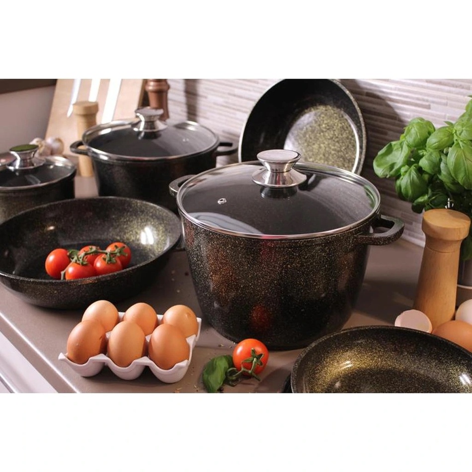 Hrnec s poklicí Kitchisimo s kvalitním nepřilnavým povrchem. K hrnci je praktická skleněná poklice s kovovým okrajem, který zabraňuje rozbití, a otvorem na odvod přebytečné páry. Díky antiadhéznímu povrchu není potřeba velké množství tuku a zároveň se pokrmy nepřipalují. Zesílené dno nádoby rovnoměrně rozvádí teplo. Hrnec je vhodný na indukční, plynový, sklokeramický i elektrický sporák. Během vaření v nádobí s nepřilnavým povrchem je lepší používat šetrné kuchařské náčiní ze dřeva, silikonu nebo melaminu. Předejdete tím zbytečnému poškrábání a prodloužíte životnost. Vzhledem k tomu, že je hrnec vhodný i do myčky na nádobí, jeho údržba je velmi snadná. Pokud myjete nádobí ještě v ruce, nepoužívejte na nádobí s nepřilnavým povrchem drátěnky. Stačí jen omýt houbičkou a saponátem. Rozměry: průměr: 28 cm průměr dna: 21,5 cm průměr indukčního dna: 19 cm šířka: 36 cm výška nádoby: 20 cm výška s poklicí: 25 cm objem 10 l materiál: hliníková slitina, nepřilnavý povrch, sklo, nerez barva: černá s mramorovým designem