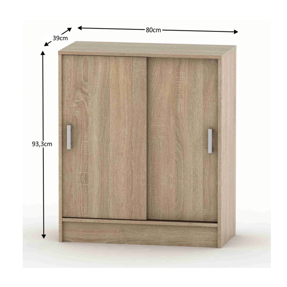 Skříňka s posuvnými dveřmi BETTY, dub sonoma je praktickým a přehledným úložným řešením do ložnice, předsíně, pracovny i studentského pokoje. Díky posuvnému otevírání šetří místo v interiéru a pohodlně se ovládá i v menších místnostech. Uvnitř nabízí praktické police, které pomohou udržet pořádek a uschovat vše od oblečení a doplňků až po dokumenty či drobnosti domácnosti.Povrch v dekoru dub sonoma působí moderně a přirozeně, snadno se kombinuje s ostatním nábytkem v místnosti. Konstrukce z kvalitní dřevotřísky zaručuje stabilitu a dlouhou životnost. Montáž je jednoduchá a skříňku sestavíte bez komplikací.Parametry: barva: dub sonoma materiál: dřevotříska dodáváno: v demontu rozměry (ŠxHxV): 80 × 39 × 93,3 cm