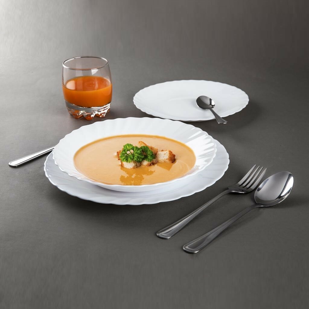 Jídelní sada s příbory Prima & Hanna je kompletní stolovací souprava pro 6 osob, která propojuje nadčasový design, vysokou odolnost a praktické použití. Kolekce kombinuje elegantní bílé talíře Prima z tvrzeného opálového skla, kvalitní sklenice Galassia a lesklé nerezové příbory Hanna, takže vytvoří jednotné stolování pro rodinné večeře i slavnostní příležitosti.Talíře ve třech velikostech mají jemně zvlněný okraj a dokonale hladký povrch, který léta neztrácí svůj vzhled. Opálové sklo je velmi pevné, lehké a až třikrát odolnější než porcelán. Lze jej používat v mikrovlnné troubě i mýt v myčce nádobí bez rizika poškrábání či zmatnění. Díky mechanické i teplotní odolnosti se hodí pro každodenní stolování.Součástí setu je také 24dílná sada příborů Hanna z nerezové oceli 18/0, které mají vysoký lesk a pohodlný tvar. Po umytí je doporučeno je důkladně osušit, aby si zachovaly svůj perfektní vzhled. Sadu doplňuje šest sklenic Galassia o objemu 300 ml z kvalitního čirého skla. Jsou univerzální – vhodné na džusy, vodu, drinky i dezerty – a bez problému je můžete mýt v myčce nádobí.Hlavní výhody produktu kompletní sada nádobí, sklenic a příborů pro 6 osob talíře z tvrzeného opálového skla s vysokou odolností příbory Hanna z nerezové oceli 18/0 v lesklém provedení sklenice Galassia z kvalitního skla všechny části vhodné do myčky nádobí nádobí vhodné do mikrovlnné trouby elegantní jednotný design pro každodenní i sváteční stolováníObsah balení 6× mělký talíř 25,5 cm 6× hluboký talíř 23 cm 6× dezertní talíř 20 cm 6× sklenice Galassia 300 ml 6× jídelní nůž 6× jídelní vidlička 6× jídelní lžíce 6× čajová lžička