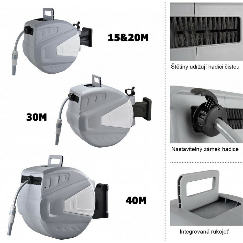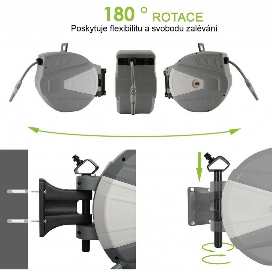 Hadicový naviják s pružinovým pohonem je určen pro každého, kdo chce extrémně snadné ovládání a komfort při zavlažování. Hadicový naviják s funkcí automatického navíjení se systém pro bezpečný návrat hadice do bubnu umožňuje automatické, plynulé navíjení a odvíjení hadice. Naviják lze připevnit na stěnu a díky otočnému nástěnnému držáku od 0 do 180 stupňů lze s navijákem manipulovat bez omezení přístupu k zalévání. Odolné plastové pouzdro s automatickým zámkem chrání hadici z PVC materiálu opatřenou integrovanou rukojetí.Parametry a specifikace: průměr hadice: 11 mm (vnitřní) a 15 mm (vnější) velikost závitu: 1/2" stříkací koncovka rychlospojka: 1 kus kohoutková přípojka otočný nástěnný držák délka hadice: 20 m (výstup) + 2 m (vstup)