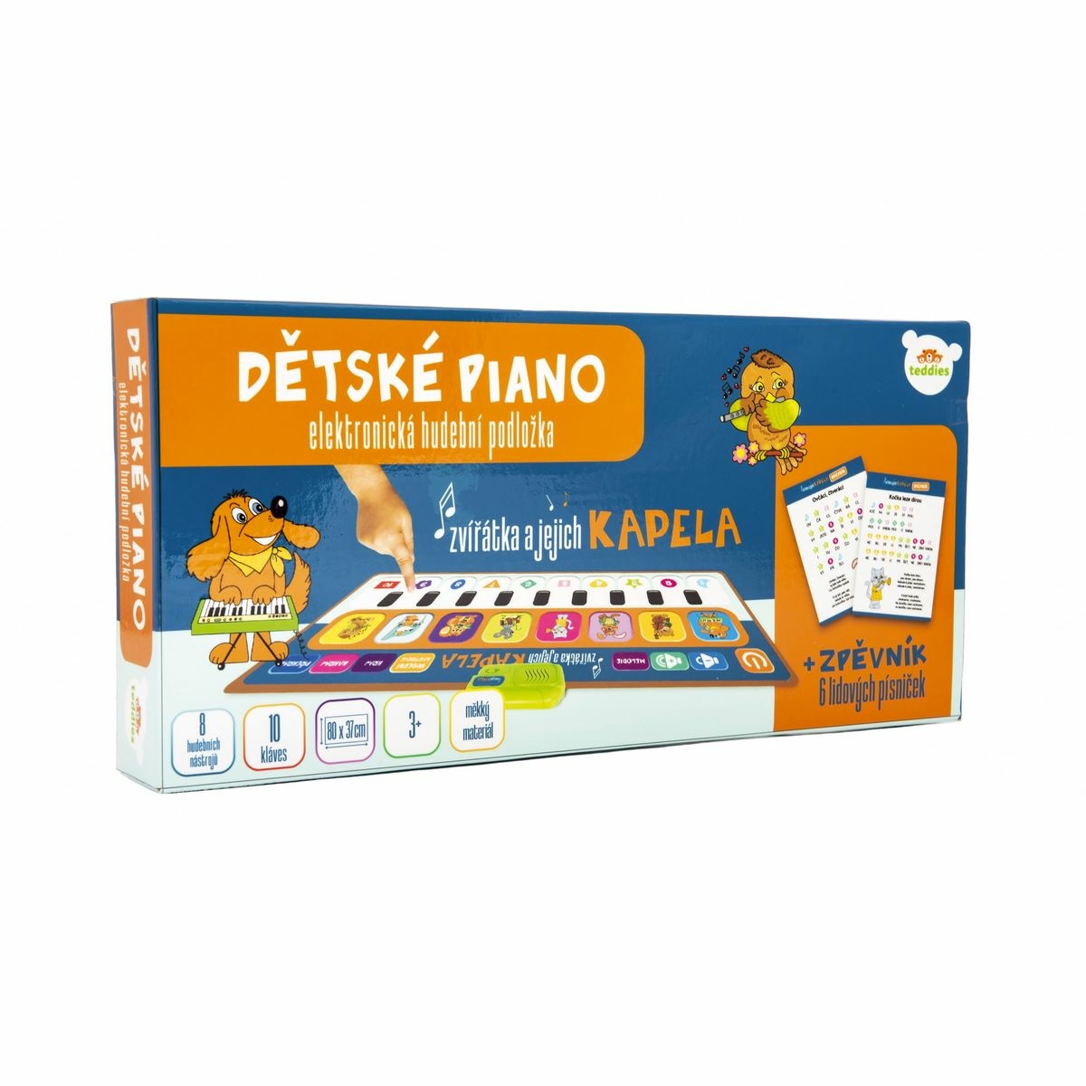Interaktivní hrací podložka (dětské piano) z řady Zvířátka a jejich kapela je skvělou pomůckou, se kterou se děti pomocí 10 kláves učí poznávat zvuky pianka. Dále můžete naučit děti 6 lidových písniček pomocí přiloženého zpěvníku. Děti mohou hrát podle barev, tvarů nebo čísel. Obsahuje také 8 kláves s hudebními nástroji. Podložka rozvíjí zvědavost, logické myšlení, schopnost vnímat barvy, tvary a rytmus. Zlepšuje smysly, zrak, sluch a cit aktivním zapojením do hry, zdokonaluje jemnou motoriku. Je z měkkého omyvatelného materiálu, který se lehce udržuje. Veselé a barevné motivy zaujmou dětskou pozornost a jsou skvělou pomůckou pro učení i seznamování se s hudbou. Baterie 3x AA nejsou součástí balení.Vhodné pro děti od 3 let.