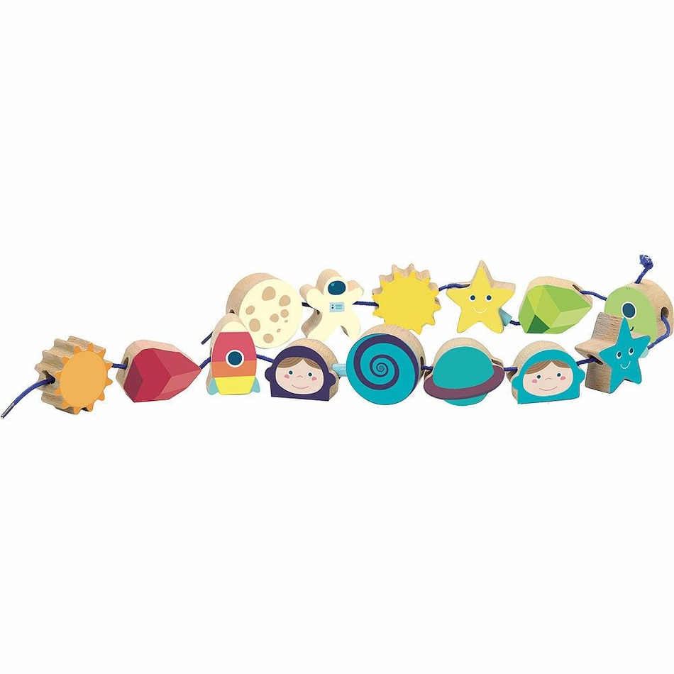 Krásná provlékačka v motivu vesmíru. V kompaktním balení najdete 14 ilustrovaných dřevěných korálků (např. astronaut, měsíc, slunce, raketa), které děti mohou navlékat na textilní šňůrku. Hračka pomáhá s rozvojem jemné motoriky. Vybaveno bezpečnostními sponami. Hračky Vilac mají značku francouzské agentury ADEME, to znamená, že tyto dřevěné hračky jsou vyráběny ekologicky. Šetří životní prostředí, neznečišťují půdu, vodu a vzduch, neplýtvají energiemi.