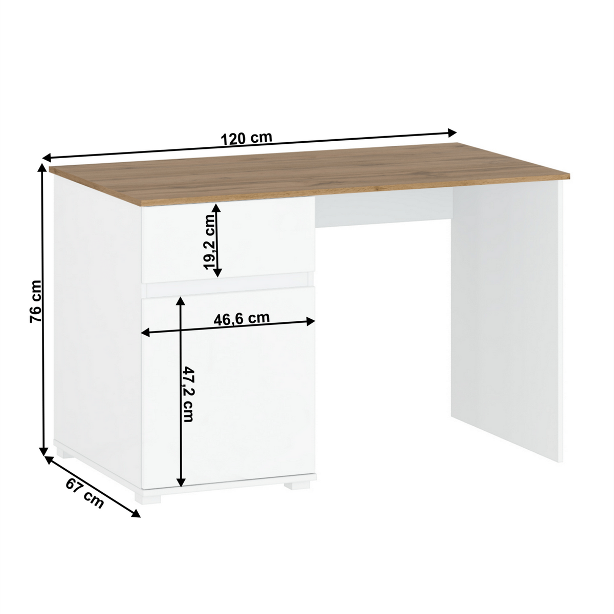 Pracovní stůl VILGO 1D1S120, lesklá bílá je součástí moderního sektorového systému VILGO, který spojuje bílý extra vysoký lesk s přírodním dekorem dub wotan. Tato elegantní kombinace dodává interiéru svěžest, lehkost a nadčasový styl. Nábytek je vyroben z kvalitní DTD laminované, doplněné o ABS hrany, zatímco dvířka jsou z MDF, takže se můžete spolehnout na pevnost, stabilitu a dlouhou životnost. Stůl se skvěle hodí do studentského pokoje, domácí kanceláře i obývacího prostoru.Psací stůl VILGO 1D1S/120 nabízí prostornou pracovní plochu, na které budete mít dost místa na psaní, notebook, dokumenty i školní pomůcky. Kromě toho je vybaven jednou zásuvkou pro menší předměty a kontejnerovou skříňkou s policí, která poskytne další praktické úložné místo. Jednoduché bezúchytkové otevírání pomocí výřezu podtrhuje moderní a čisté linie celého designu.Parametry: materiál: DTD laminovaná / ABS hrany / MDF barva: bílý extra vysoký lesk / dub wotan rozměry (ŠxHxV): 120 × 67 × 76 cm rozměry kontejneru (ŠxV): 46,6 × 47,2 cm výška zásuvky: 19,2 cm tloušťka materiálu: 1,6–2,2 cm obsahuje 1 zásuvku a 1 skříňku s policí otevírání/zavírání pomocí výřezu dodáváno v demontu