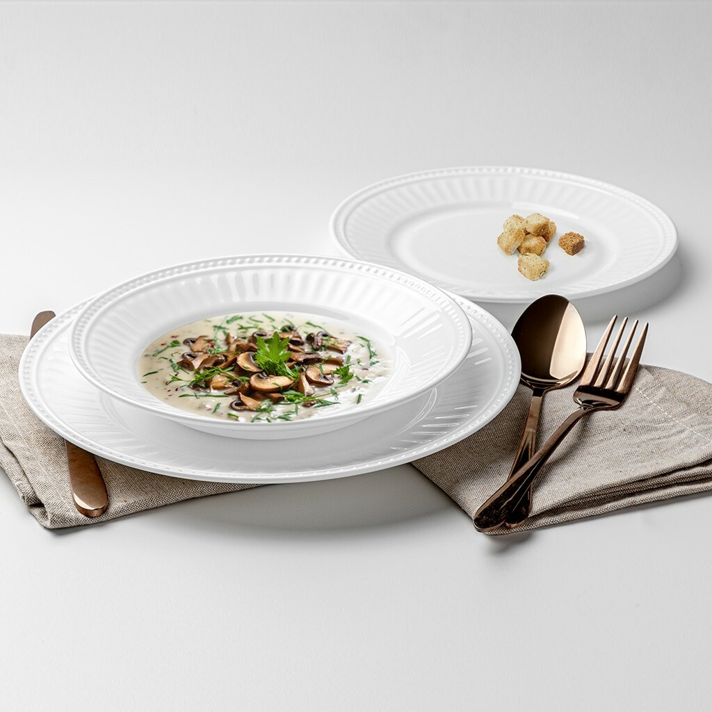 Jídelní sada Roma od značky Florina přináší nadčasový vzhled a elegantní zpracování pro každodenní stolování i slavnostní příležitosti. Bílý design s jemným plastickým reliéfem vytváří čistý, harmonický dojem a snadno zapadne do různých stylů interiéru. Proporčně vyvážené talíře pomáhají esteticky servírovat pokrmy a podtrhnou jejich vizuální stránku.Použité opalové sklo je vysoce odolné vůči nárazům, poškrábání i teplotním změnám. Talíře nepohlcují pachy ani barviva a jejich hladký povrch usnadňuje každodenní údržbu. Sadu lze pohodlně mýt v myčce nádobí a bez obav používat v mikrovlnné troubě. Sada je vhodná pro rodinné stolování i každodenní provoz v domácnosti. Sada obsahuje celkem 18 talířů, takže je ideální až pro 6 osob. Hluboké talíře dobře poslouží na polévky a těstoviny, mělké talíře na hlavní jídla a dezertní talířky na sladkosti, pečivo či ovoce. Díky univerzálním rozměrům a pevnému provedení představuje praktický a dlouhodobý doplněk kuchyně.Hlavní výhody produktu odolný opálový materiál vhodný pro každodenní použití klasický reliéfní design v nadčasové bílé vhodné do mikrovlnné trouby možnost mytí v myčce nádobí nízká nasákavost a snadná údržba sada pro servírování kompletního chodu pro 6 osobObsah balení 6× mělký talíř 25 cm 6× hluboký talíř 20 cm 6× dezertní talíř 20 cm