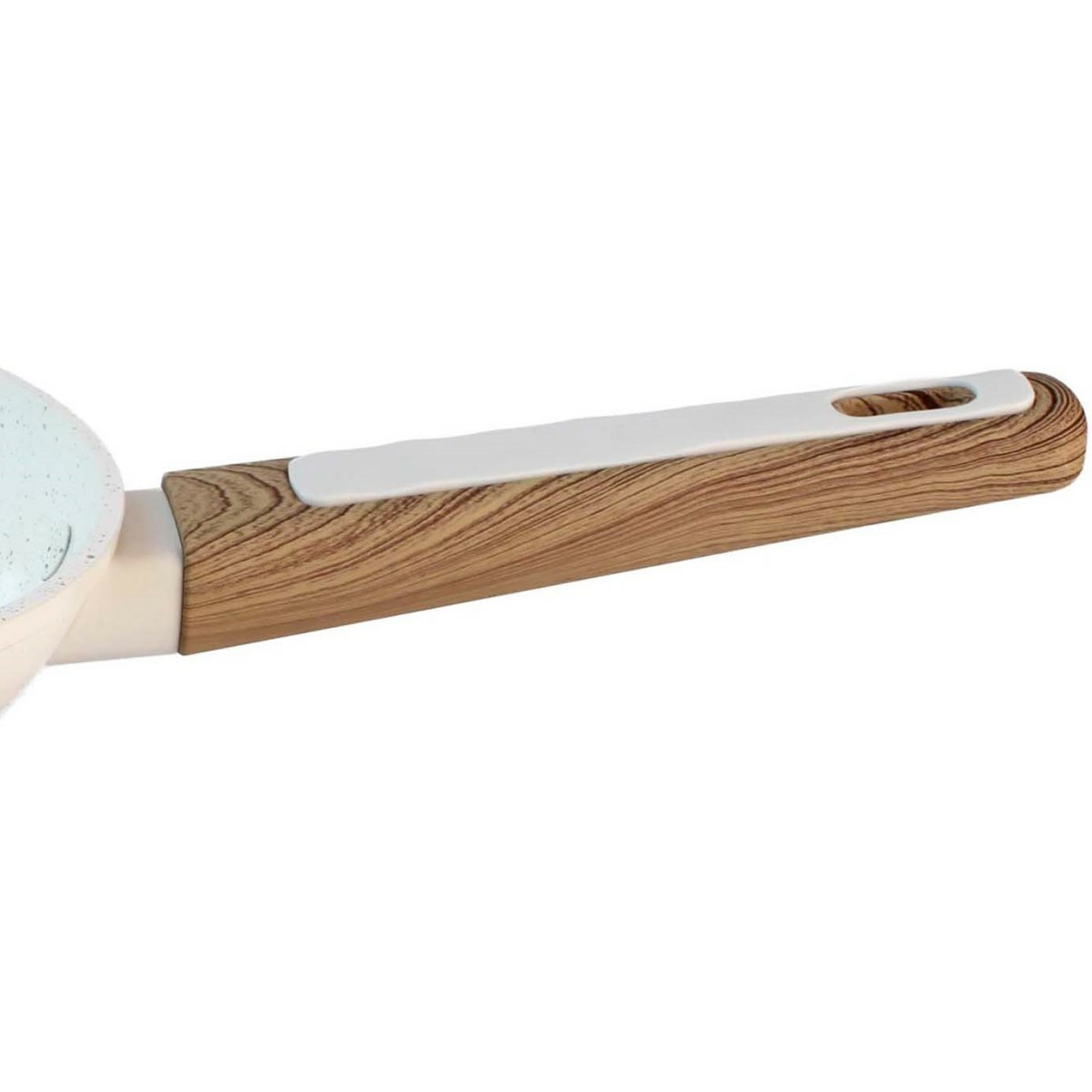Pánev s keramickým povrchem Bianco od značky Kitchisimo přináší jemný krémový vzhled, který v kuchyni působí lehce a přirozeně. Kombinace světlé barvy, decentního žíhání a elegantního vroubkování po obvodu vytváří dojem čistoty a harmonie. Povrch uvnitř pánve zdobí drobné tečky připomínající přírodní kameninu, takže nádobí působí nadčasově a snadno zapadne do moderní i rustikální kuchyně. Tělo pánve tvoří pevný silnostěnný hliník, který rovnoměrně rozvádí teplo a zůstává stabilní i při vyšších teplotách. Vnitřní keramický nepřilnavý povrch usnadňuje vaření s minimem tuku a pomáhá zabránit připékání. Rukojeť z odolného plastu s úpravou soft touch příjemně sedí v ruce, neklouže a imituje přírodní kresbu dřeva, která doplňuje celkový světlý design kolekce Bianco. Pánev můžete používat na všech typech sporáků včetně indukce, což z ní dělá praktickou volbu do každé domácnosti.Pánev lze umýt v myčce, ale pro dlouhodobé zachování hladkosti povrchu doporučujeme ruční čištění měkkou houbičkou. Povrch chrání také používání silikonového či dřevěného náčiní, které zamezuje poškrábání. Pro pohodlné uskladnění nechybí závěsné oko na konci rukojeti a při skladování více kusů doporučujeme vložit proložku k ochraně nepřilnavého povrchu. Hlavní výhody produktu keramický nepřilnavý povrch s kameninovým vzhledem silnostěnné hliníkové tělo pro rovnoměrné vedení tepla rukojeť soft touch s imitací dřeva vhodná na indukční, plynové, sklokeramické i elektrické sporáky snadná údržba a možnost mytí v myčce lehká manipulace díky kompaktním rozměrům součást kolekce Bianco pro dokonale sladěnou kuchyňObsah balení 1× pánev 20 cm