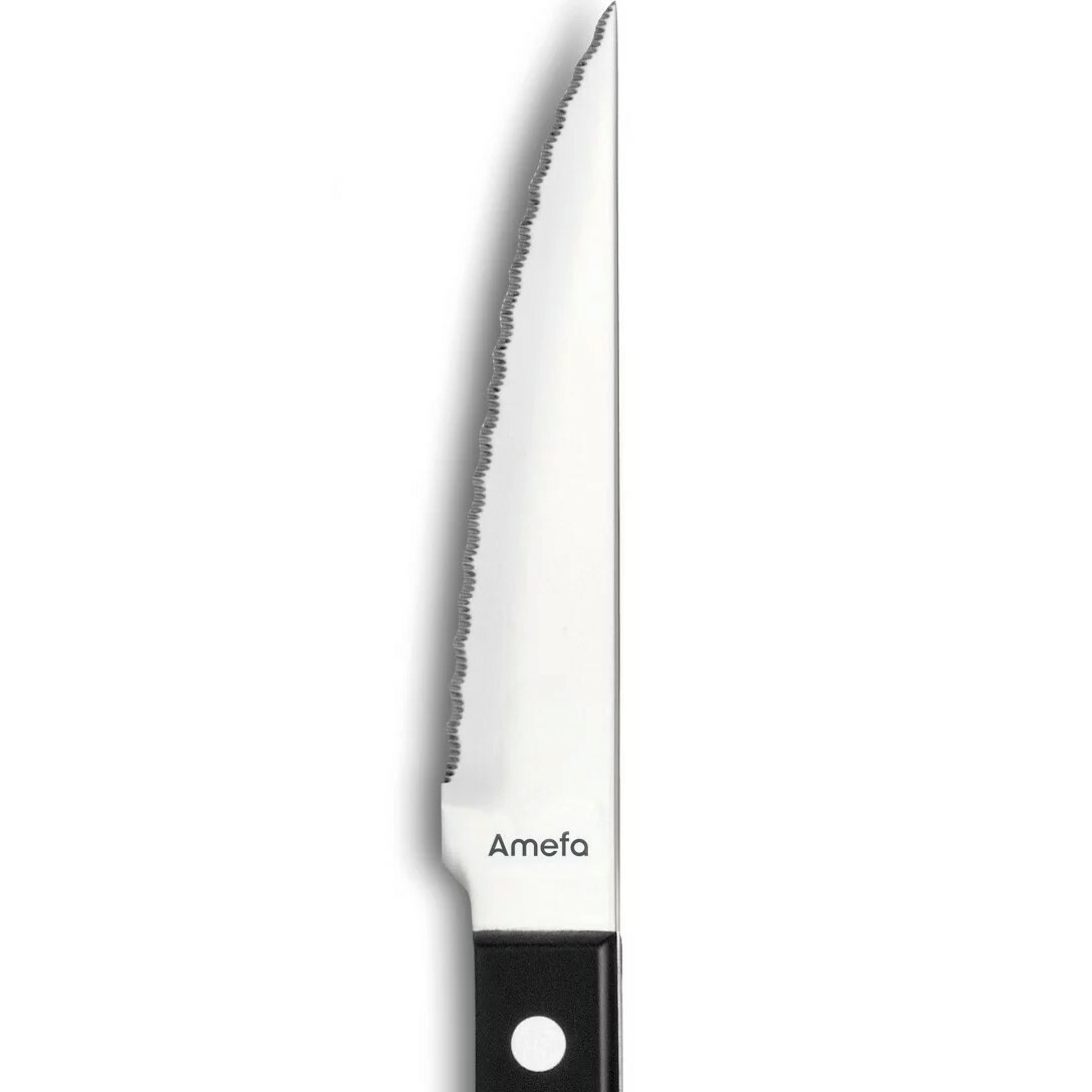6dílná sada steakových nožů Pizza od značky Amefa je ideální volbou pro milovníky masa, pizzy i grilovaných pokrmů. Elegantní a praktický design v sobě spojuje tradiční tvar s moderním provedením, které se hodí jak na běžné stolování, tak na venkovní grilování nebo rodinné oslavy. Nože jsou vyrobeny z kvalitní nerezové oceli, která zajišťuje dlouhou životnost, odolnost proti korozi a stálý lesk. Každá čepel je opatřena precizně zubatým ostřím, které snadno pronikne i skrz šťavnaté steaky nebo křupavou pizzu. Rukojeť z odolného plastu je připevněna dvěma nýtky, což zaručuje pevné spojení s čepelí a bezpečné uchopení při krájení. Díky ergonomickému tvaru se nůž pohodlně drží v ruce a zajišťuje maximální kontrolu při používání. Sada nožů je vhodná pro každodenní použití a snadno se čistí. Hlavní výhody produktu 6 ostrých steakových nožů se zubatým ostřím vyrobeno z vysoce kvalitní nerezové oceli ergonomická rukojeť s dvojitým nýtováním ideální na steaky, pizzu a grilované pokrmy odolnost vůči korozi a dlouhá životnost elegantní a nadčasový design snadná údržbaObsah balení 6× steakový nůž Amefa Pizza