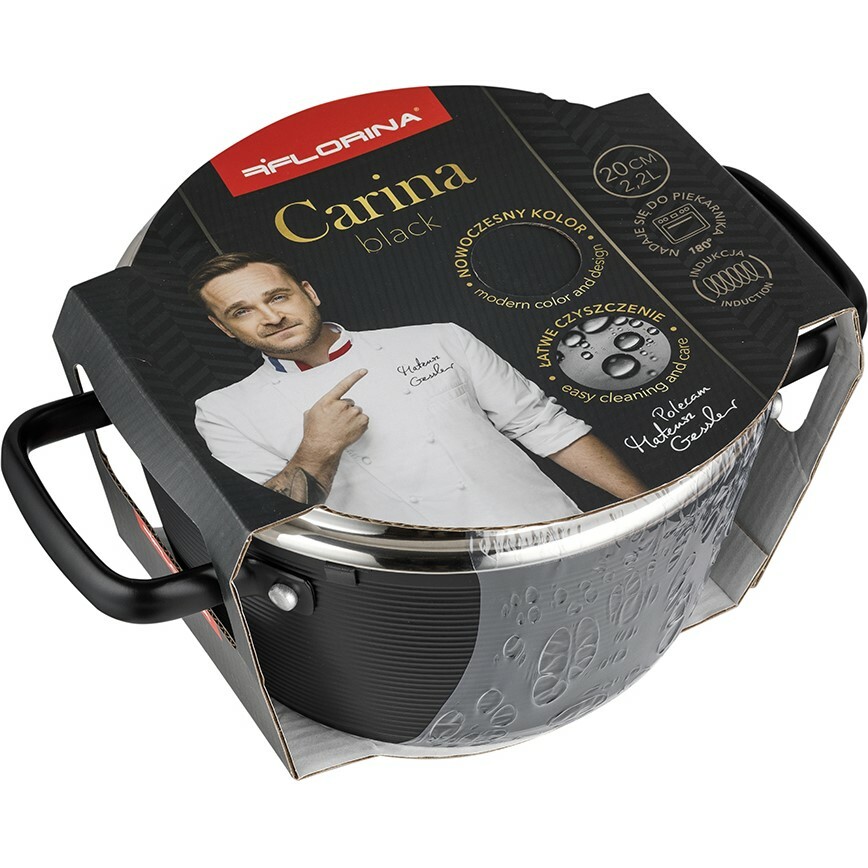 Hrnec Carina Black od značky Florina o objemu 2,2 l a průměru 20 cm je elegantní a funkční nádobí, které ocení každý, kdo rád vaří s kvalitním vybavením. Vyrobený je z hliníku, takže se rychle a rovnoměrně zahřívá, zatímco keramický povrch je odolný proti poškrábání, nelepí a usnadňuje následné čištění. Díky tomu je hrnec ideální pro každodenní přípravu pokrmů.Kolekce Carina Black přináší moderní design v podobě černého pruhovaného povrchu, který působí elegantně a dokonale kontrastuje s jemně šampaňským vnitřkem. Hrnec je doplněn o praktická boční ucha z nerezové oceli lakované na černo a o skleněnou poklici, která umožňuje kontrolovat vaření bez zbytečného ztrácení tepla. Lze jej používat na všech typech sporáků včetně indukce a je vhodný i do trouby do 180 °C.Na výrobu bylo použito až 90 % recyklovaného hliníku, díky čemuž je kolekce šetrná k životnímu prostředí. Nádobí Carina Black vzniklo ve spolupráci se šéfkuchařem Mateuszem Gesslerem a spojuje odolnost, praktičnost i atraktivní vzhled, který se hodí do každé kuchyně.Hlavní výhody produktu odolný keramický povrch s vysokou ochranou proti poškrábání vhodný na všechny druhy sporáků včetně indukce možnost použití v troubě do 180 °C moderní design s kontrastem černého vnějšku a šampaňského vnitřku pohodlné úchyty z černě lakované nerezové oceli ekologické provedení – 90 % recyklovaného hliníku skleněná poklice pro kontrolu vařeníObsah balení 1× hrnec Carina Black 2,2 l, 20 cm 1× skleněná poklice