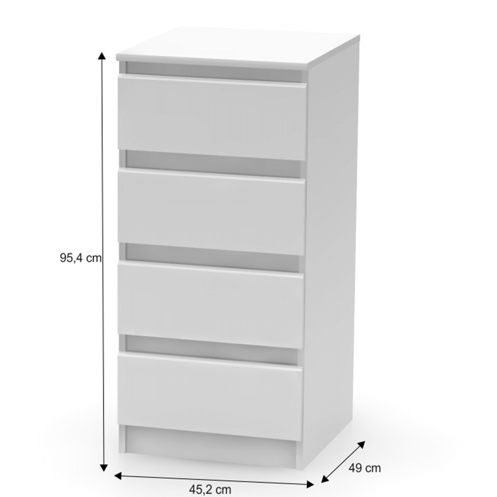Komoda HANY NEW 009, bílá, je všestranný a elegantní úložný kus nábytku, který najde své místo v ložnici, obývacím pokoji, předsíni či dětském pokoji. Její čisté bílé provedení snadno prosvětlí interiér a dodá mu moderní vzhled. Komoda nabízí čtyři praktické zásuvky, ve kterých uložíte oblečení, dokumenty, šperky či další drobnosti, které chcete mít pečlivě uspořádané. Vyrobena je z kvalitní laminované dřevotřísky s ABS hranami, což zaručuje odolnost, dlouhou životnost a snadnou údržbu. Díky preciznímu zpracování a modernímu designu se stane přirozenou součástí vašeho domova.Parametry: materiál: DTD laminovaná barva: bílá rozměry: 45,2 × 49 × 95,4 cm tloušťka materiálu: 16 mm četnost: 4 zásuvky ABS hrany kvalitní slovenský výrobek dodáváno v demontu