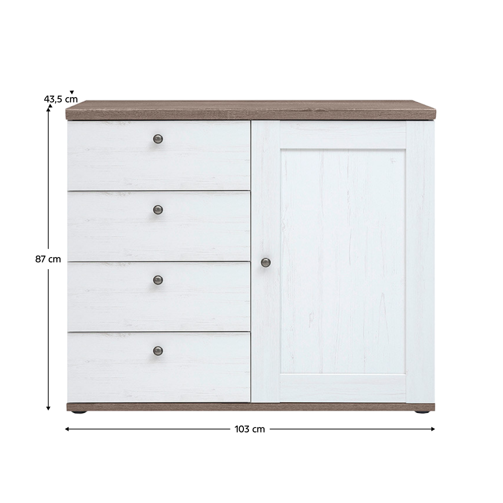 Komoda TEINA 4S1D, borovice canyon vyniká krásnou kombinací dekorů borovice canyon a dub sonoma trufel, které do místnosti vnášejí hřejivou atmosféru a jemnou eleganci. Systém TEINA stojí na jednoduchých liniích a romantickém duchu, díky čemuž působí útulně a současně moderně. Kvalitní laminovaná DTD zajišťuje pevnost a snadnou údržbu, zatímco kovové úchyty v barvě staré stříbro podtrhují stylové ladění celého sektoru.Komoda TEINA KOM4S1D nabízí praktické uspořádání úložného prostoru – čtyři šuplíky pro přehledné uložení drobností a jednu skříňku s policí, která rozděluje prostor na dvě části. Je vhodná do ložnice, obývacího pokoje, předsíně i dětského pokoje a snadno ji zkombinujete s dalšími prvky kolekce.Parametry: materiál: laminovaná DTD barva: borovice canyon / dub sonoma trufel rozměry (ŠxHxV): 103 × 43,5 × 87 cm tloušťka materiálu: 1,6 cm 4 šuplíky, nosnost jednoho šuplíku: 3 kg police ve skříňce, nosnost police: 5 kg kovové úchyty v barvě stará stříbrná dodáváno v demontu