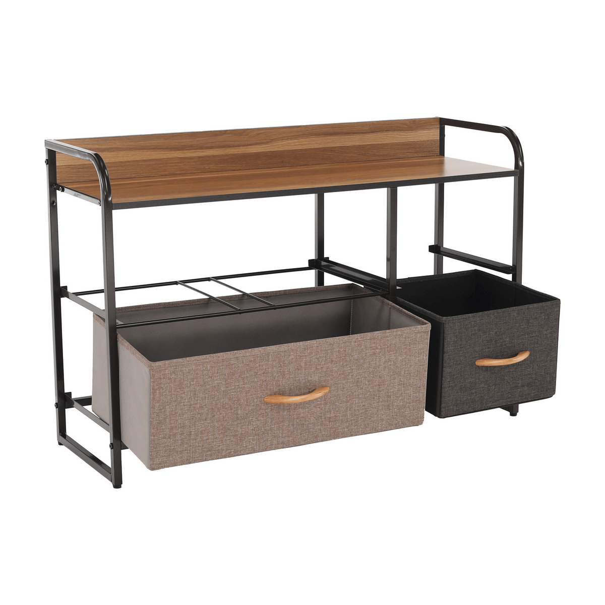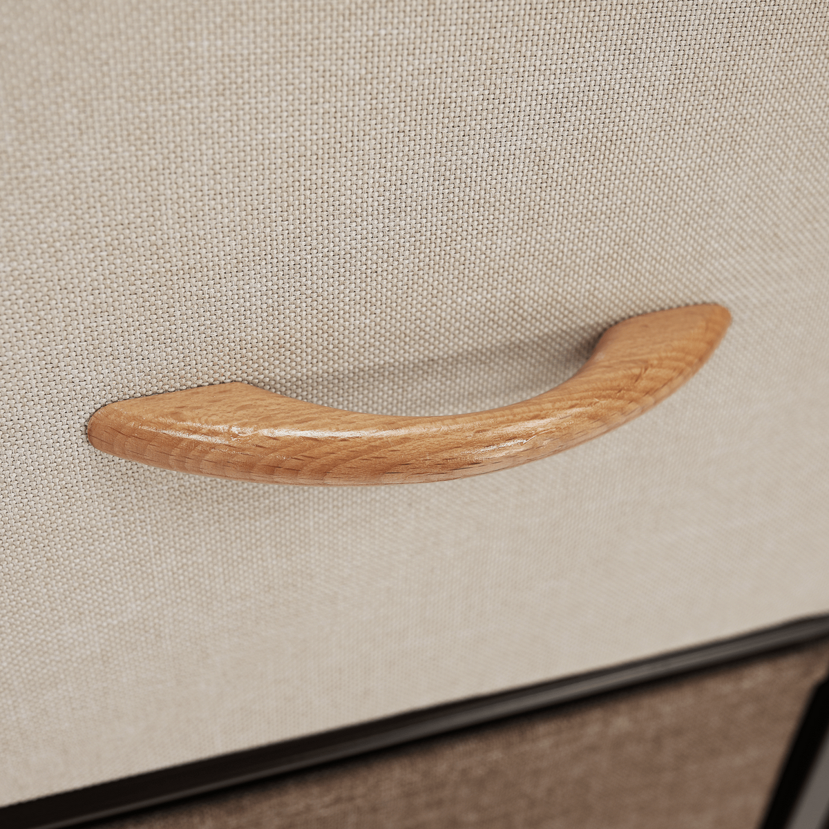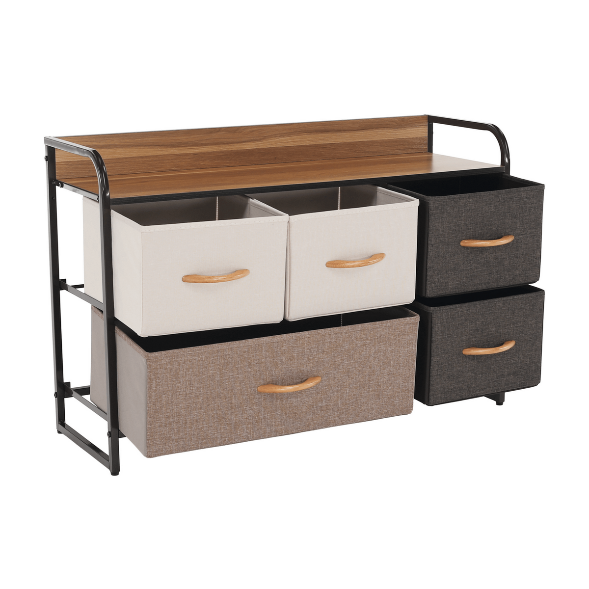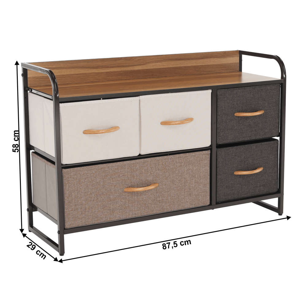 Komoda s látkovými šuplíky HAZEL TYP 4 v kombinaci černé a hnědé je stylovým a praktickým řešením pro úložné prostory v obývacím pokoji, ložnici či chodbě. Stabilní kovová konstrukce a dřevěná horní deska poskytují pevný základ, zatímco pět textilních zásuvek v odstínech béžové, světle hnědé a tmavě hnědé umožňuje přehledné uspořádání věcí. Zásuvky se snadno vysouvají, jsou lehké a díky různým velikostem nabídnou vhodné místo pro oblečení, doplňky i drobnosti každodenní potřeby. Komoda stojí na nožičkách, což usnadňuje úklid a dodává konstrukci stabilitu. Montáž je jednoduchá, takže ji rychle připravíte k použití.Parametry: počet zásuvek: 5 materiál: kov / látka / dřevo barva: černá, hnědá (béžová, světle hnědá, tmavě hnědá) rozměry: 87,5 × 31,7 × 58 cm dodáváno v demontu
