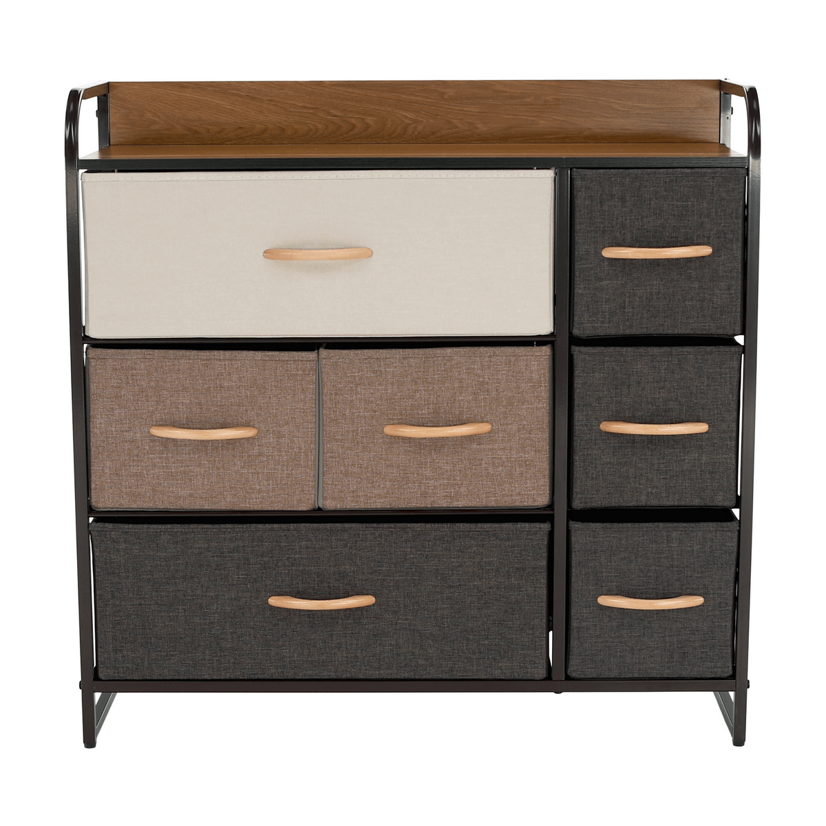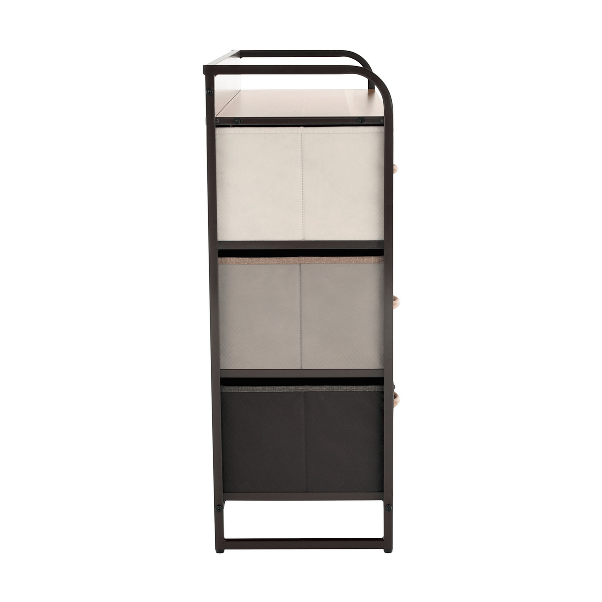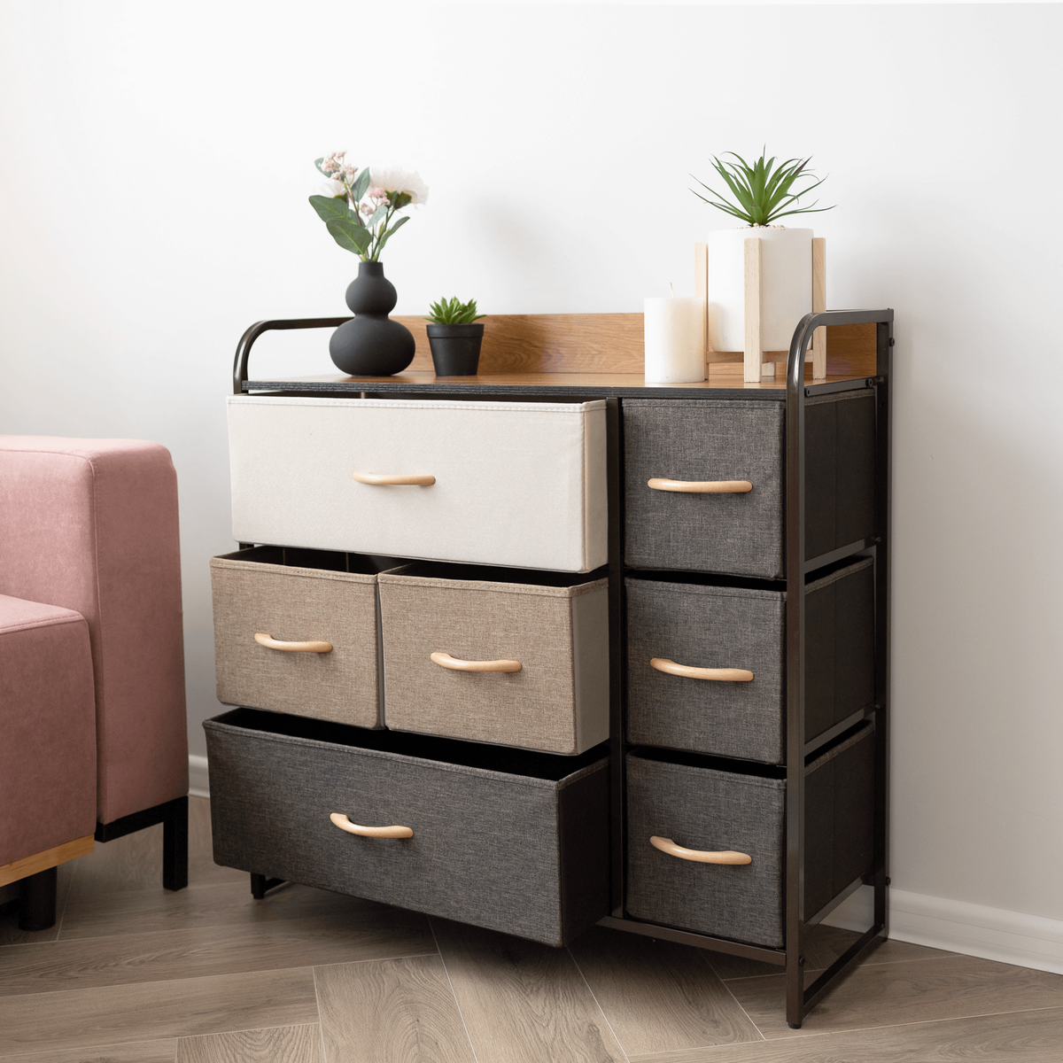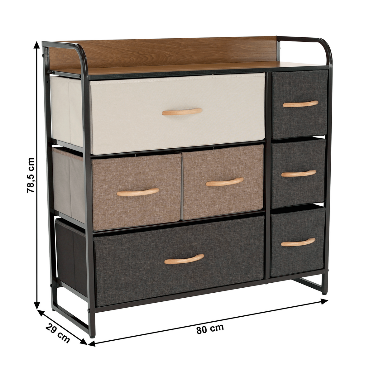 Komoda s látkovými šuplíky HAZEL TYP 3 v kombinaci černé a hnědé nabízí přehledné a velmi praktické úložné řešení pro obývací pokoj, ložnici či dětský pokoj. Stabilní kovová konstrukce, doplněná o dřevěnou horní desku, poskytuje pevnou oporu pro celou sestavu. Sedm textilních zásuvek v odstínech béžové, světle hnědé a tmavě hnědé nabízí dostatek prostoru pro oblečení, doplňky i drobnosti, které chcete mít vždy po ruce. Zásuvky jsou lehké, snadno vyjímatelné a díky rozmanitým velikostem umožňují praktické třídění uložených věcí. Komoda stojí na nožičkách a její montáž je rychlá a jednoduchá.Parametry: počet zásuvek: 7 materiál: kov / látka / dřevo barva: černá, hnědá (béžová, světle hnědá, tmavě hnědá) rozměry: 80 × 31,7 × 78,5 cm dodáváno v demontu