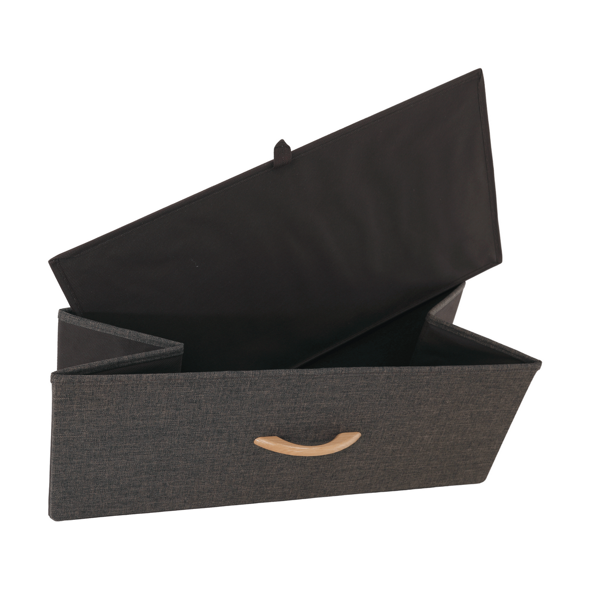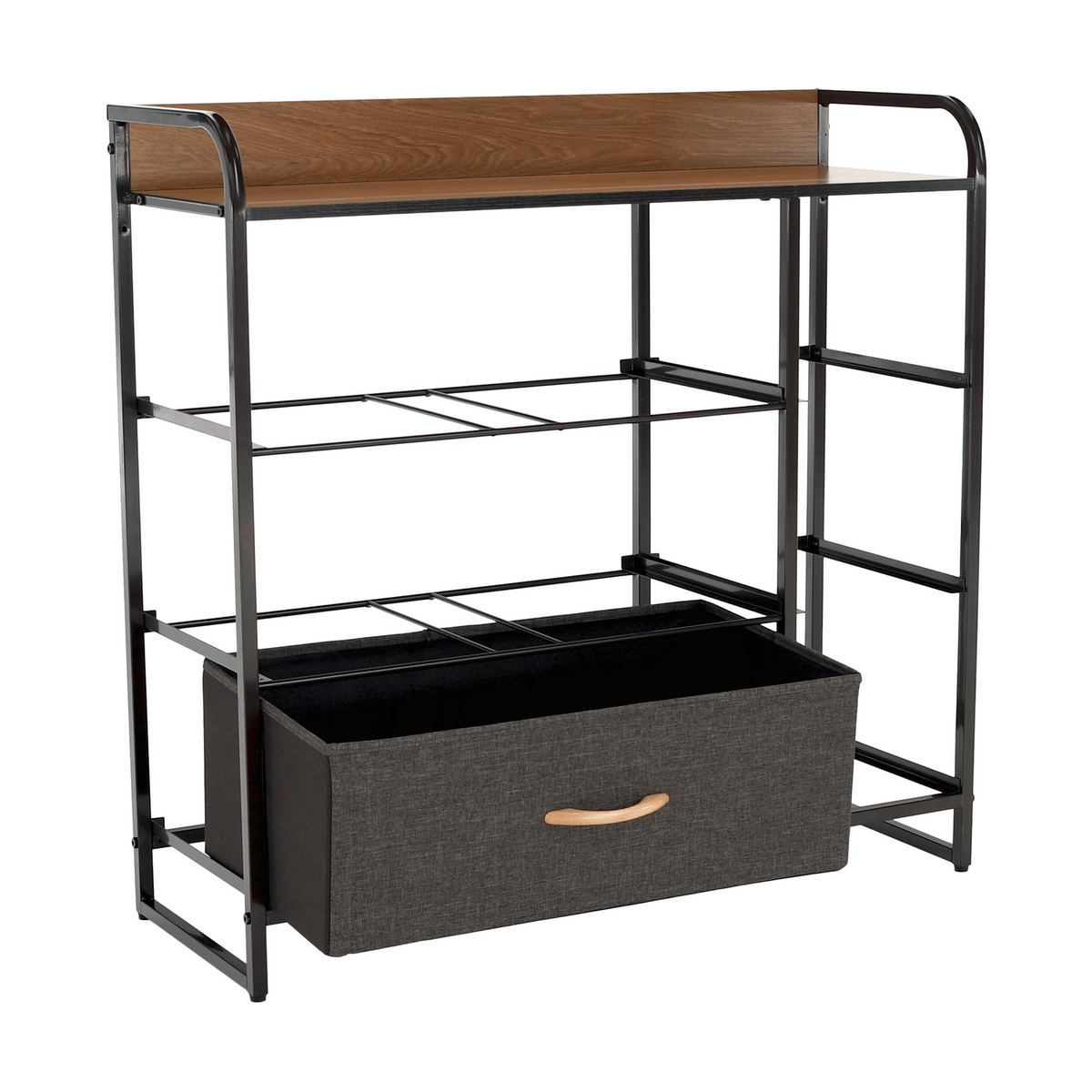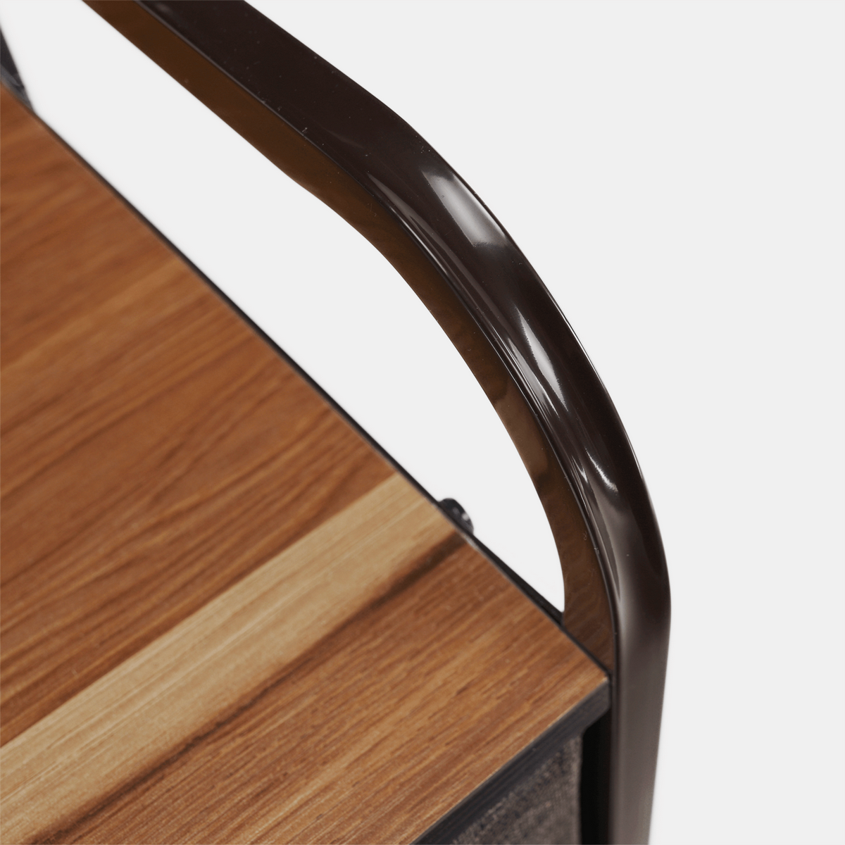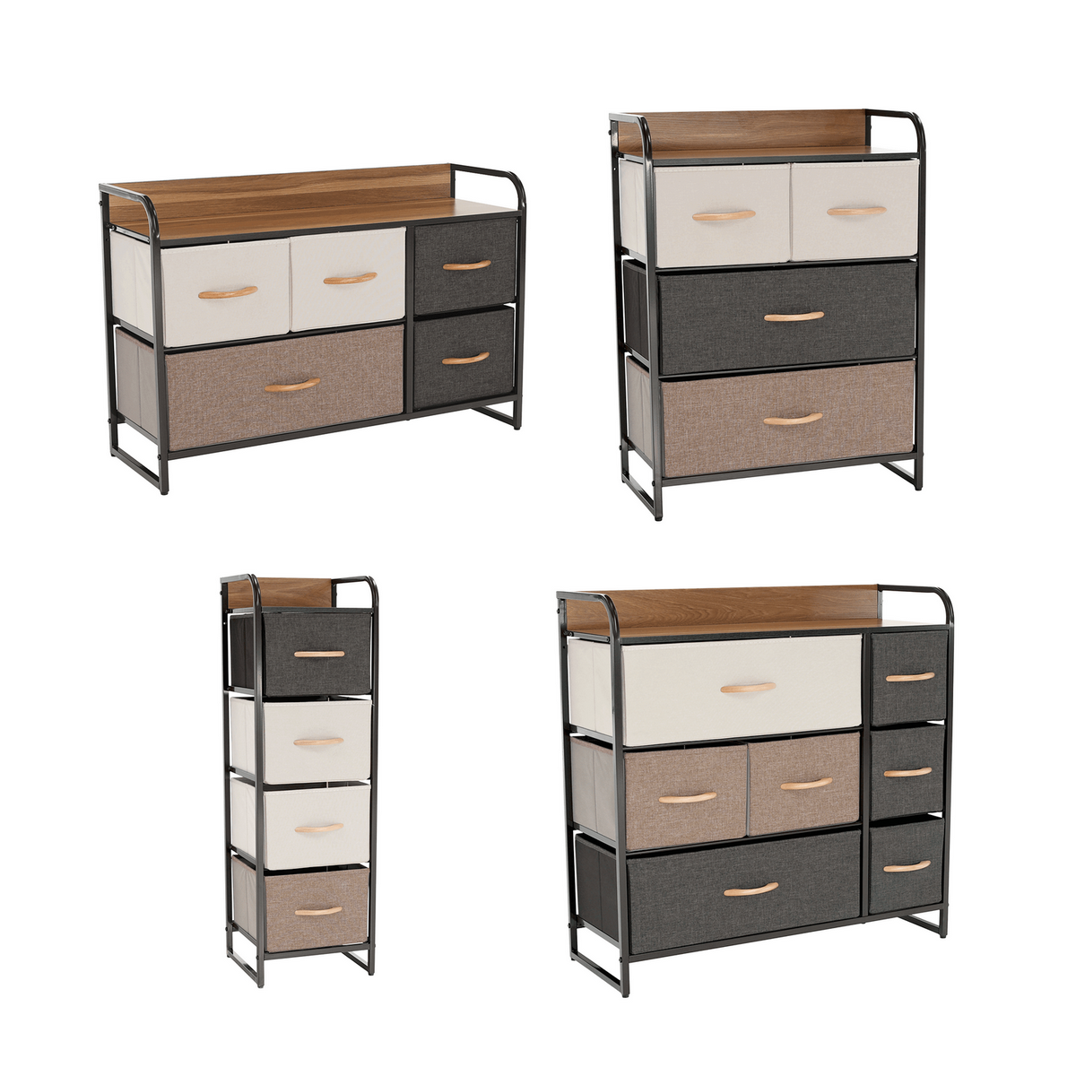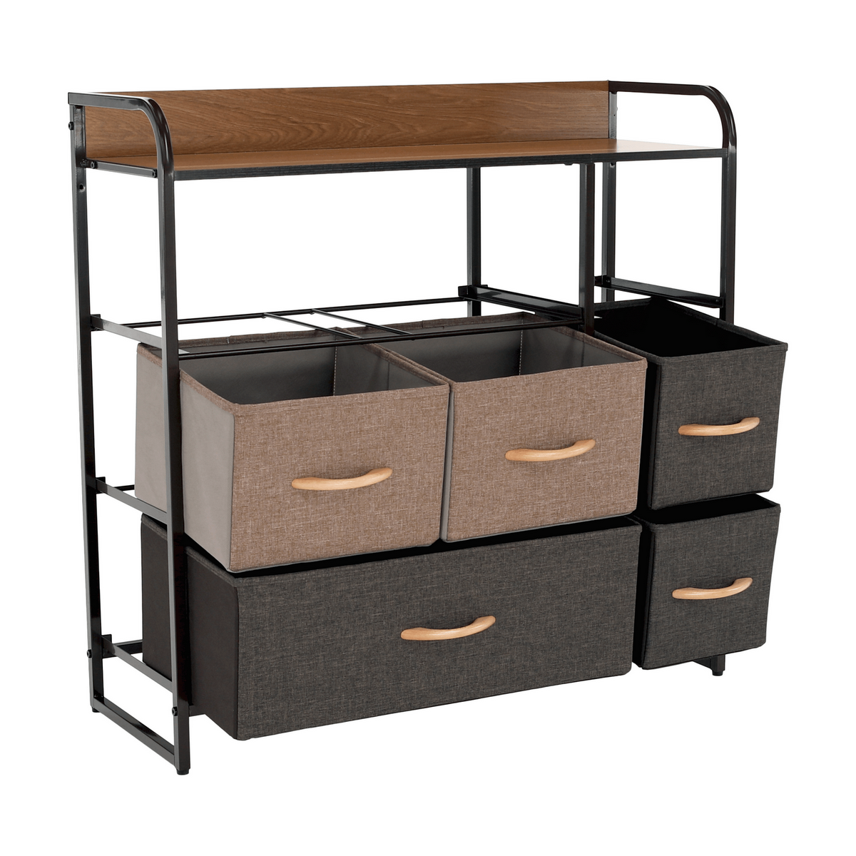 Komoda s látkovými šuplíky HAZEL TYP 3 v kombinaci černé a hnědé nabízí přehledné a velmi praktické úložné řešení pro obývací pokoj, ložnici či dětský pokoj. Stabilní kovová konstrukce, doplněná o dřevěnou horní desku, poskytuje pevnou oporu pro celou sestavu. Sedm textilních zásuvek v odstínech béžové, světle hnědé a tmavě hnědé nabízí dostatek prostoru pro oblečení, doplňky i drobnosti, které chcete mít vždy po ruce. Zásuvky jsou lehké, snadno vyjímatelné a díky rozmanitým velikostem umožňují praktické třídění uložených věcí. Komoda stojí na nožičkách a její montáž je rychlá a jednoduchá.Parametry: počet zásuvek: 7 materiál: kov / látka / dřevo barva: černá, hnědá (béžová, světle hnědá, tmavě hnědá) rozměry: 80 × 31,7 × 78,5 cm dodáváno v demontu