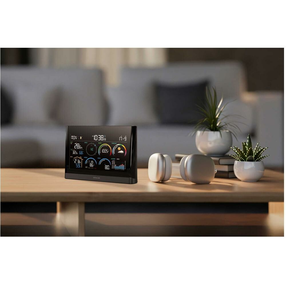 SENCOR SWS 11000 přináší možnosti pokročilé meteorologie přímo do domácnosti. Ať už patříte mezi zahrádkáře, počasí je vaším koníčkem, nebo zkrátka chcete mít přehled, jistě vás zaujme široká nabídka funkcí, které stanice nabízí. SWS 11000 je vybavena barevným TRUE BLACK displejem o úhlopříčce 7,4", který má 3 úrovně jasu. Automaticky se přizpůsobí světelným podmínkám v místnosti. Díky bezdrátovému senzoru 5v1 se švýcarskými čidly SENSIRION, který obdržíte společně s hlavní jednotkou, dokáže hlavní jednotka monitorovat teplotu, vlhkost, tlak, směr a rychlost větru, množství dešťových srážek a další veličiny.Předpovědi i výstrahy extrémních teplotMeteostanice SWS 11000 zobrazuje aktuální meteorologické údaje a jejich vývoj v čase. Umožní vám tak lépe porozumět povětrnostním podmínkám ve vaší lokalitě. Předpověď na 12 až 24 hodin je generována na základě tlaku a teploty vzduchu. Na displeji můžete vidět barevné ikony předpovědi. Mezi další funkce patří ukazatele: rosný bod, pocitová teplota nebo chlad větru. Nastavitelné výstrahy na extrémní teploty a detailní informace o síle a směru větru – včetně Beaufortovy stupnice – rozšiřují praktické využití zařízení.Buďte stále v obrazeHlavní jednotku spustíte a jednoduše nastavíte. Je vhodná k umístění na stůl i zavěšení na zeď. Bezdrátový snímač 5v1 má dosah až 150 metrů v otevřeném prostoru a umožňuje tak flexibilní umístění okolo domu. Možnost připojení až sedmi dalších senzorů a doplňkové funkce jako zobrazení data, času, dnů v týdnu v různých jazycích, fáze měsíce nebo budík z ní činí skutečně univerzální meteorologickou stanici, jejíž hlavní jednotku můžete umístit třeba na noční stolek. Díky kombinaci síťového napájení a záložních baterií (3× AAA, můžete dokoupit zvlášť) zůstane hlavní jednotka funkční i během výpadku elektřiny. Snímač 5v1 vyžaduje k provozu 3 baterie AA, které nejsou součástí balení.Technické parametry a specifikace: TRUE BLACK barevný LCD displej s úhlopříčkou 7,4" (18,8 cm) 3 úrovně jasu displeje: Vysoká/Nízká/Automatické stmívání senzor pro automatické nastavení jasu podsvícení švýcarská čidla SENSIRION (snímač 5v1) předpověď na 12~24 hodin založená na změně tlaku a teploty vzduchu předpovědi počasí (slunečno, mírně oblačno, zataženo, déšť, bouřka, sněžení) měření vnitřní teploty a vlhkosti s indikátorem komfortu a vývoje měření venkovní teploty a vlhkosti s indikátorem vývoje sloupcový graf pro zobrazení historie dešťových srážek (uplynulých 6 dnů) a tlaku vzduchu (-1, -3, -6, -12, -18, -24 hodin) barometrický tlak v relativních nebo absolutních hodnotách (hPa, inHg, mmHg) s indikátorem vývoje rozsah měření vnitřní teploty: -5 °C až +50 °C rozsah měření venkovní teploty: -40 °C až +60 °C rozsah měření vnitřní vlhkosti: 1 % až 99 % RV rozsah měření venkovní vlhkosti: 1 % až 99 % RV meteorologické indexy pro pocitovou teplotu, chlad větru, rosný bod a index teploty poryv větru nebo průměrná rychlost větru (v mph, m/s, km/h, uzlech) Beaufortova stupnice momentální a dominantní směr větru měření dešťových srážek pomocí denního, týdenního, měsíčního a celkového množství deště (mm/in) nastavení výstrahy pro vnitřní/venkovní teplotu a vlhkost (nízká/vysoká) nastavení výstrahy (pro meteorologické podmínky, např. vysoká rychlost větru, vysoký úhrn srážek atd.) blikající indikátor výstrahy pro vysokou/nízkou hodnotu zobrazení času, kalendáře, dnů v týdnu a měsíční fáze výstraha před náledím a funkce alarmu záznamy max./min. hodnot v paměti hodinový záznam za uplynulých 24 hodin rádiem řízené hodiny a datum pomocí signálu DCF77, s aktualizací letního času (DST) (možnost ručního nastavení) den v týdnu v 7 jazycích (EN, DE, FR, ES, IT, NL, RU) zobrazení teploty volitelně v °C/°F snímač 5v1: rychlost větru, směr větru, dešťové srážky, teplota a vlhkost (součástí příslušenství) přenos na dlouhou vzdálenost mezi hlavní jednotkou a snímačem - až do vzdálenosti 150 m (v otevřeném prostoru) bezdrátový snímač 5v1 – Frekvence hlavní jednotky: 868 MHz podpora až 7 TH senzorů (SWS TH8600-9898-12500-16600 / SWS T POOL PRO) (senzory nejsou součástí balení) napájecí adaptér hlavní jednotky: DC 5 V / 600 mA (součást příslušenství), spotřeba: 3 W záložní baterie hlavní jednotky: 3x 1,5 V typu AAA (baterie nejsou součástí balení) baterie pro napájení 5v1 snímače: 3x 1,5 V typu AA (baterie nejsou součástí balení – doporučujeme nenabíjecí lithiové baterie) umístění na stůl nebo na stěnu rozměry hlavní jednotky: (š/v/h) 202 x 138 x 38 mm rozměry bezdrátového snímače 5v1: (š/v/h) 343 x 394 x 136 mm hmotnost hlavní jednotky: 515 g (bez baterií, bez adaptéru) hmotnost bezdrátového snímače 5v1: 740 g (včetně baterií)
