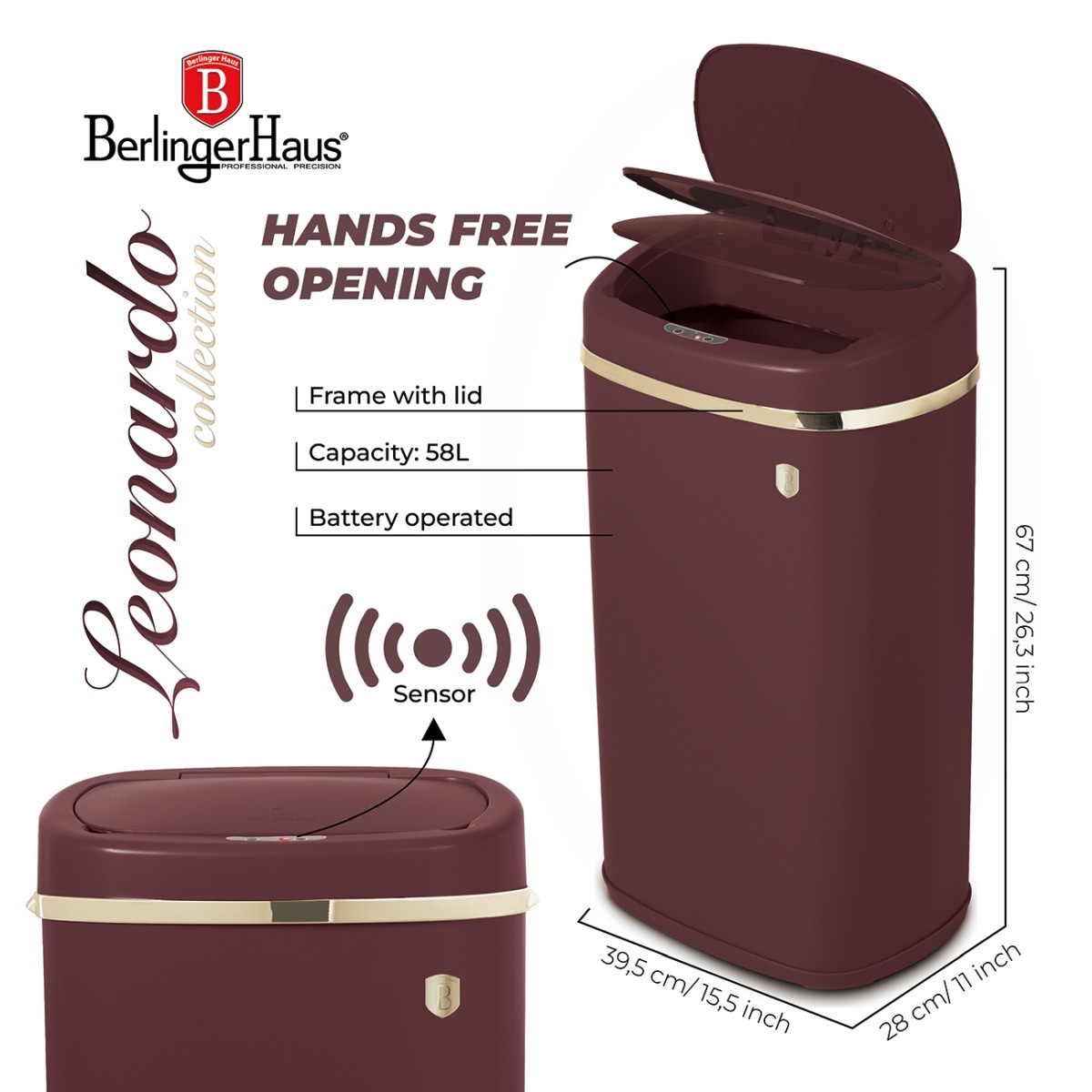 Bezdotykový odpadkový koš Leonardo od značky BerlingerHaus je dokonalým spojením moderní technologie, hygieny a luxusního designu. Díky infračervenému senzoru se víko koše automaticky otevře při přiblížení ruky nebo předmětu, takže manipulace s odpadem je rychlá, pohodlná a zcela bezdotyková. Elegantní matná bordeaux barva v kombinaci se zlatým pojistným kroužkem dodává koši prémiový vzhled, který perfektně zapadne do moderních kuchyní i kancelářských prostor.Robustní konstrukce z kvalitní ocelia plastu zaručuje dlouhou životnost, zatímco odnímatelný vnitřní rám usnadňuje výměnu pytlů a udržování čistoty. Koš má velkorysý objem 58 litrů, což z něj činí ideální volbu pro větší domácnosti či místa s vyšším provozem. Ovládání je zcela automatické, napájené čtyřmi AA bateriemi (nejsou součástí balení), a senzor má dostatečně rychlou reakci pro pohodlné použití.Kromě praktičnosti a hygieny vyniká i estetickým zpracováním – jemně zaoblené hrany, luxusní zlaté detaily a minimalistický vzhled činí z tohoto odpadkového koše nejen užitečný, ale i stylový doplněk interiéru.Hlavní výhody produktu: bezdotykové otevírání díky infračervenému senzoru velký objem 58 l – ideální pro domácnosti i kanceláře robustní ocelová konstrukce s odnímatelným vnitřním rámem elegantní matná bordeaux barva se zlatými detaily hygienické a praktické řešení bez nutnosti dotyku víka jednoduchá údržba a snadná výměna pytlůObsah balení: 1× odpadkový koš se senzorem 58 l