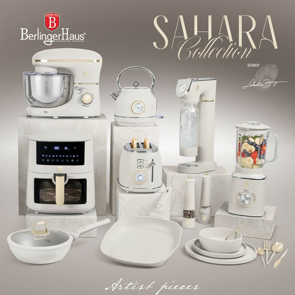 15dílná sada nádobí Sahara Marble od německé značky BerlingerHaus nabízí kompletní výbavu pro každodenní vaření i slavnostní příležitosti. Elegantní krémový design s mramorovým efektem dodává nádobí luxusní vzhled, zatímco kvalitní zpracování zajišťuje dlouhou životnost a pohodlné používání.Každý kus je vyroben z odolného litého hliníku a opatřený třívrstvým titanovým povrchem TitanPro, který je nepřilnavý, odolný proti poškrábání a neobsahuje PFAS, olovo ani kadmium. Vaření je tak zdravější, bezpečné a s minimálním množstvím oleje. Rukojeti a knoflíky s mramorovým dekorem mají soft-touch úpravu, která je příjemná na dotek a zůstává chladná i při dlouhém vaření.Skleněná víka s parním ventilem, silikonovým těsněním a praktickým okrajem pro cezení zajišťují maximální komfort při každodenní práci v kuchyni. Díky turbo indukčnímu dnu se teplo rychle a rovnoměrně rozvádí, což šetří čas i energii. Sada je vhodná pro všechny typy sporáků – plynové, elektrické, sklokeramické i indukční. Součástí je také kuchyňské náčiní a silikonové podložky pro bezpečné odkládání horkého nádobí.Hlavní výhody produktu třívrstvý titanový povrch TitanPro s nepřilnavými vlastnostmi elegantní design v krémové barvě s mramorovým efektem ergonomické rukojeti a knoflíky s měkkým dotykem, zůstávají chladné skleněná víka se silikonovým těsněním, parním ventilem a funkcí cezení turbo indukční dno pro rychlý a rovnoměrný rozvod tepla vhodné na všechny typy sporáků bez PFAS, olova a kadmiaObsah balení 1× hluboká pánev 24 × 6,5 cm / 2,3 l 1× pánev 28 × 5,2 cm / 2,4 l 1× kastrol s víkem 20 × 11 cm / 2,6 l 1× kastrol s víkem 24 × 12,5 cm / 4,3 l 1× kastrol s víkem 28 × 13 cm / 6,3 l 1× hrnec s víkem 16 × 7,5 cm / 1,2 l 3× kuchyňské náčiní (obracečka s drážkami, naběračka na špagety, naběračka na polévku) 2× silikonová podložka
