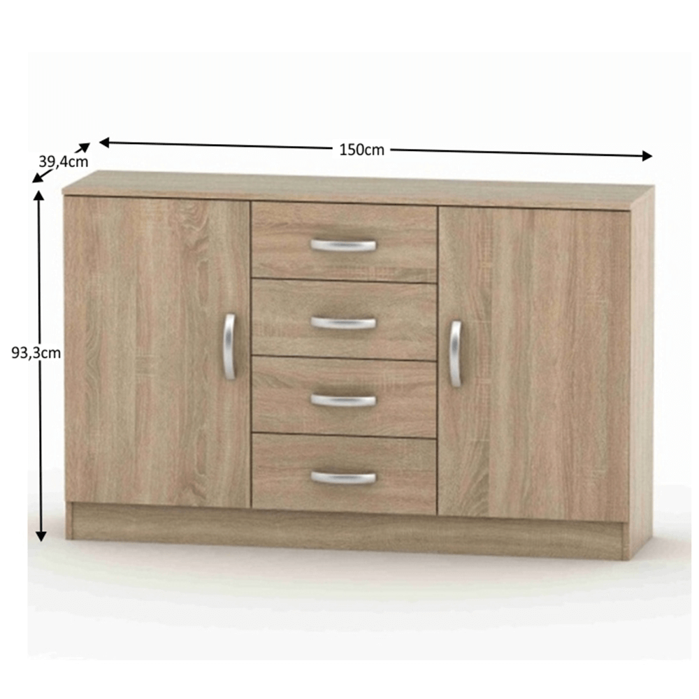 Komoda BETTY 2, dub sonoma je univerzální úložný nábytek, který se díky svému příjemnému dekoru dub sonoma skvěle hodí do ložnice, studentského pokoje i předsíně. Nabízí praktické rozvržení úložného prostoru – čtyři zásuvky uprostřed a dvě boční skříňky s policemi, díky kterým získáte dostatek místa na oblečení, dokumenty, ložní prádlo či drobnosti každodenní potřeby. Kovové úchytky dodávají komodě moderní vzhled a zajišťují pohodlné otevírání.Korpus je vyroben z kvalitní dřevotřísky, která se vyznačuje dlouhou životností a snadnou údržbou. Komoda stojí přímo na podstavci bez nožiček, což zajišťuje pevnou stabilitu. Svým nadčasovým vzhledem doplní světlé i tmavší interiéry a snadno se kombinuje s dalším nábytkem v podobném dekoru.Parametry: počet zásuvek: 4 počet dveří: 2 barva: dub sonoma materiál: dřevotříska dodáváno v demontu: ano rozměry (ŠxHxV): 150 × 39,4 × 93,3 cm
