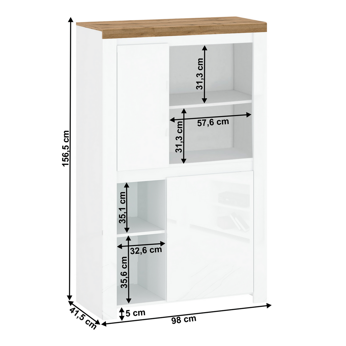Skříňka VILGO 2D, lesklá bílá je součástí moderního sektorového systému VILGO, který spojuje bílý extra vysoký lesk s přírodním dekorem dub wotan. Tato elegantní kombinace dodává interiéru čistý, svěží a nadčasový vzhled. Nábytek je vyroben z kvalitní DTD laminované s odolnými ABS hranami, zatímco dvířka jsou z MDF, což zaručuje dlouhou životnost a stabilitu. Kolekce VILGO nabízí široký výběr prvků a umožňuje flexibilně zařídit obývací pokoj, ložnici i studentský pokoj.Regál VILGO 2D oceníte díky jeho promyšlenému úložnému prostoru, který je rozdělen do čtyř částí. Horní část tvoří otevřené police, ideální pro knihy, dekorace nebo rodinné fotografie. Spodní část pak nabízí dvě skříňky s dvířky, kde jsou umístěny praktické police pro uložení všeho, co nechcete mít na očích. Moderní bezúchytové otevírání pomocí výřezů podtrhuje jednoduchý, čistý design regálu.Parametry: materiál: DTD laminovaná / ABS hrany / MDF barva: bílý extra vysoký lesk / dub wotan rozměry (ŠxHxV): 98 × 41,5 × 156,5 cm výška spodního prostoru od podlahy: 5 cm tloušťka materiálu: 1,6–2,2 cm 2 skříňky s policemi otevřený úložný prostor s policemi rozměry vrchních polic: 57,6 × 31,3 cm rozměry první spodní police: 32,6 × 35,1 cm rozměry druhé spodní police: 32,6 × 35,6 cm MDF dvířka otevírání pomocí výřezu dodáváno v demontu