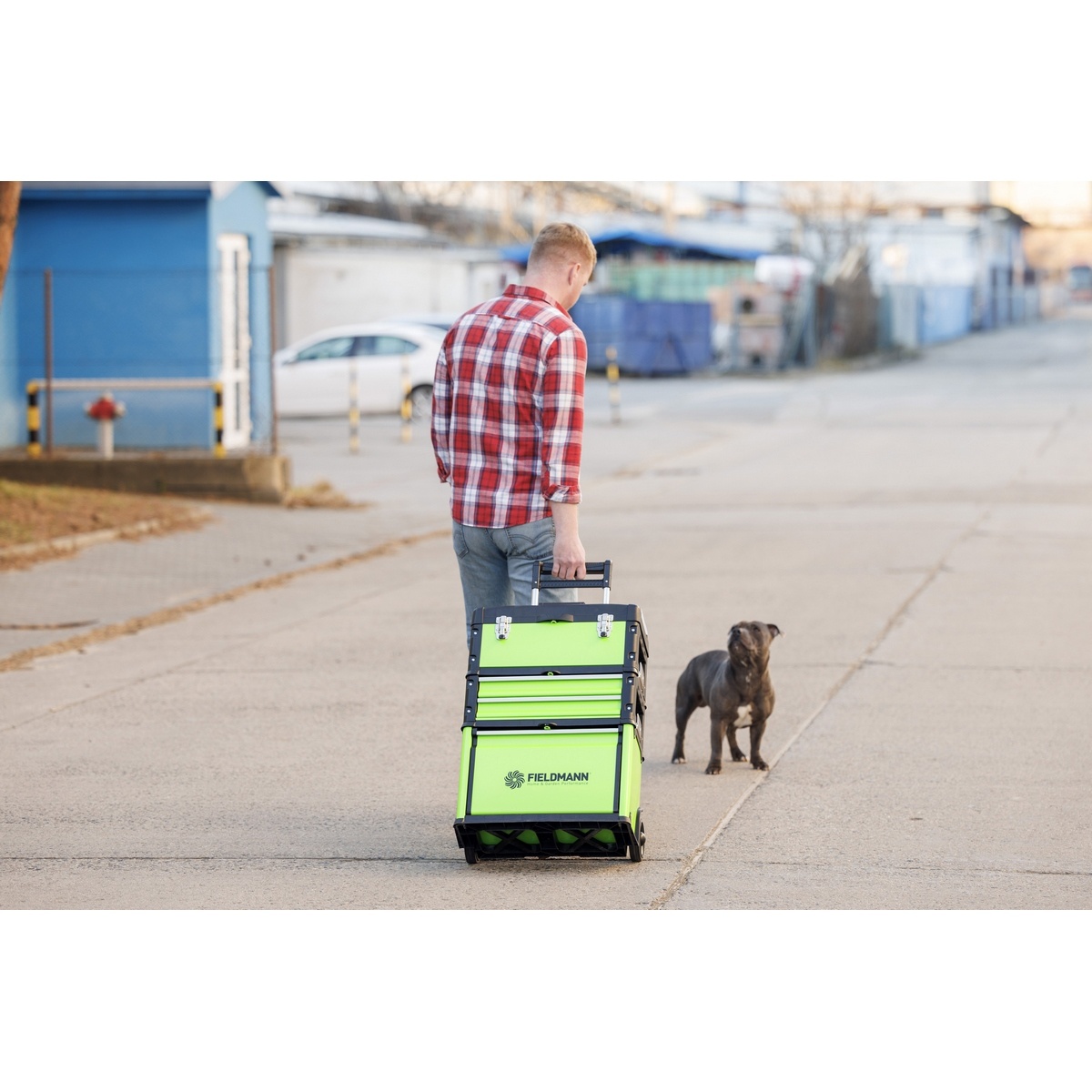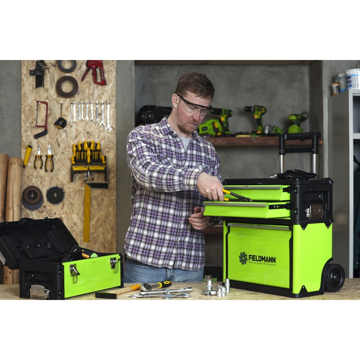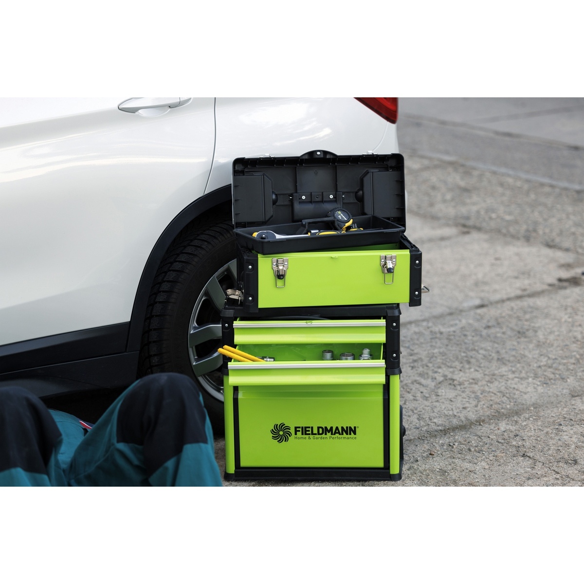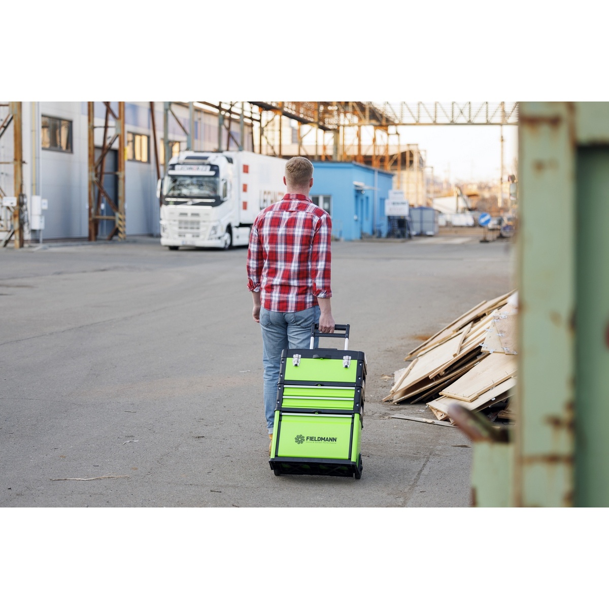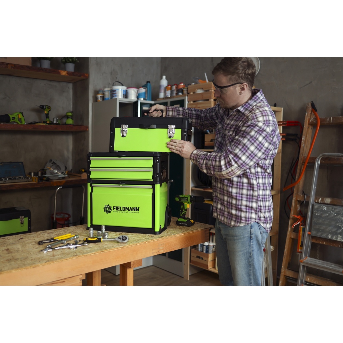 Třídílný box na nářadí FDN 4150, je vyrobený z kovu, má tedy bytelnou konstrukci, která zajistí odolnost i bezpečí pro uložené věci. S jeho pomocí snadno, rychle a bez větší námahy dopravíte množství nástrojů, příslušenství a drobného materiálu i na větší vzdálenosti např. na chalupu, na stavbu apod.Jednotlivé části boxu jsou členěny tak, aby měl každý nástroj či materiál své místo a uživatel nemusel ztrácet čas zdlouhavým hledáním. V menších přihrádkách ve víku horního boxu uložíte drobný, např. spojovací materiál, o kterém budete mít perfektní přehled díky krytu z průhledného pevného plastu. Vyjímatelná plastová přihrádka s rukojetí pak pojme další drobnosti a nářadí a v boxu zbyde ještě dost prostoru na větší nástroje. Druhý díl nabízí dvě výsuvné zásuvky s dostatkem místa např. pro sadu nejčastěji používaných šroubováků nebo klíčů.Spodní díl – velký úložný box s výklopným víkem – pak poskytuje opravdu velkorysý prostor pro pomocníky větších rozměrů, jakými jsou elektrický šroubovák, vrtačka, bruska apod. Všechny tři boxy jsou opatřeny vyklápěcími madly, aby je bylo možné přenášet i jednotlivě. Každý z nich je po stranách vybaven také bytelnými přezkami, kterými se mezi sebou vzájemně propojí v jeden pevný celek, aby byla zajištěna stabilita i bezpečnost celé sady při převážení. Robustní teleskopické madlo poslouží při převozu, při manipulaci s jednotlivými částmi ale nebude překážet. Kolečka z tvrzeného plastu zaručují dlouhou životnost celého boxu.