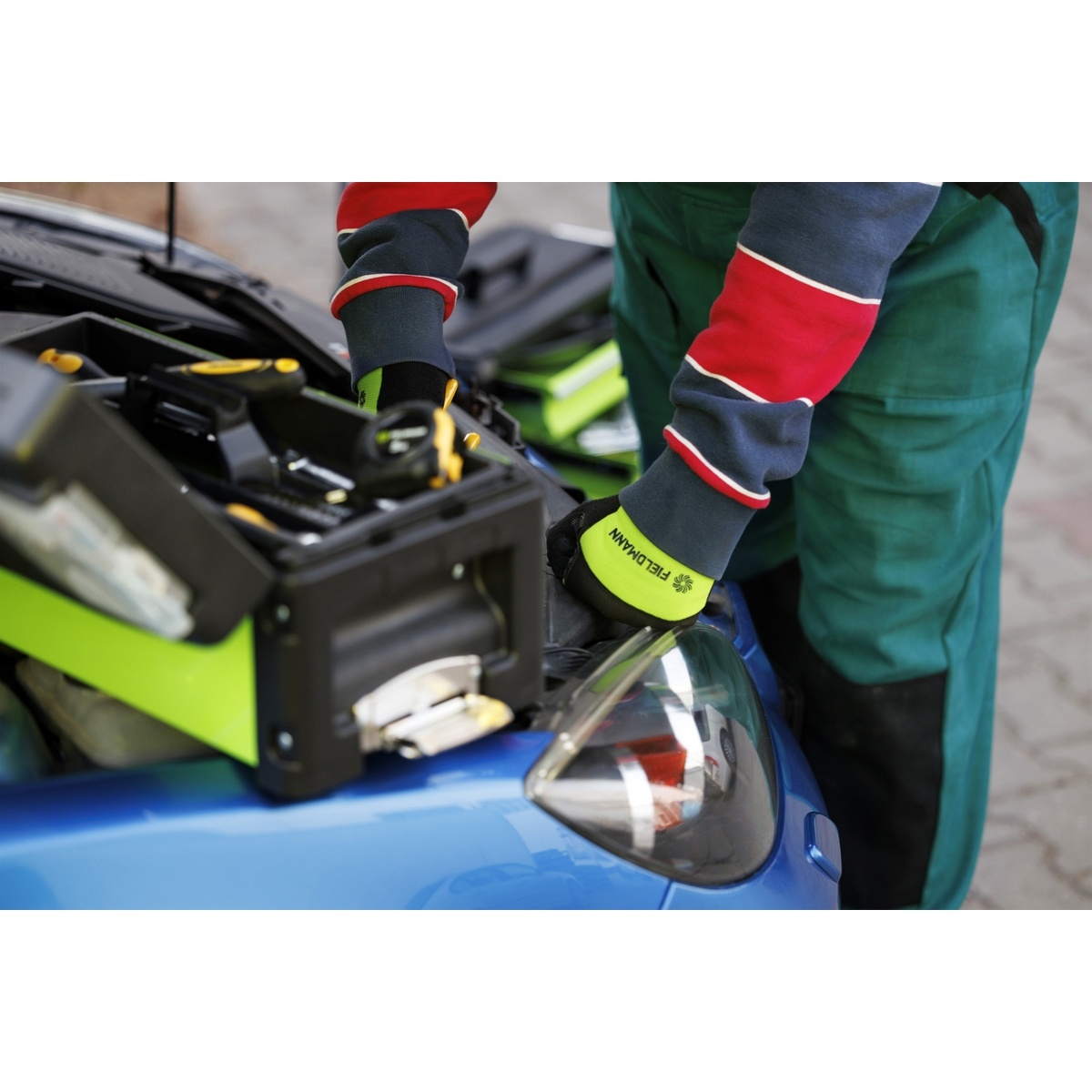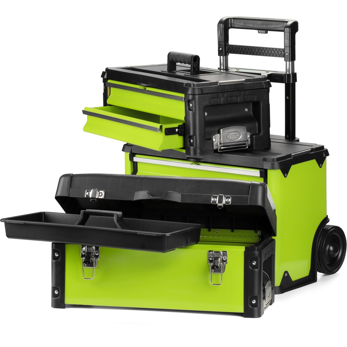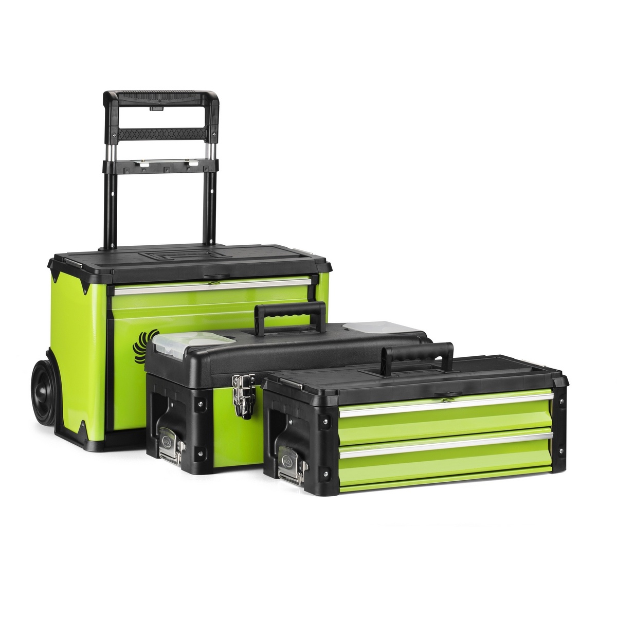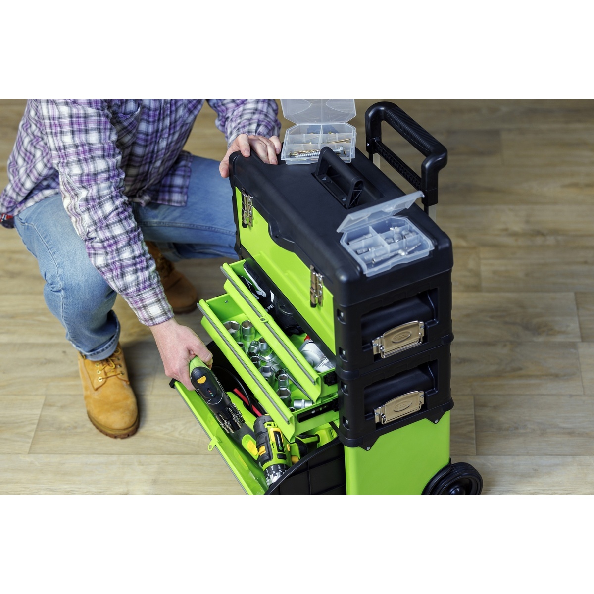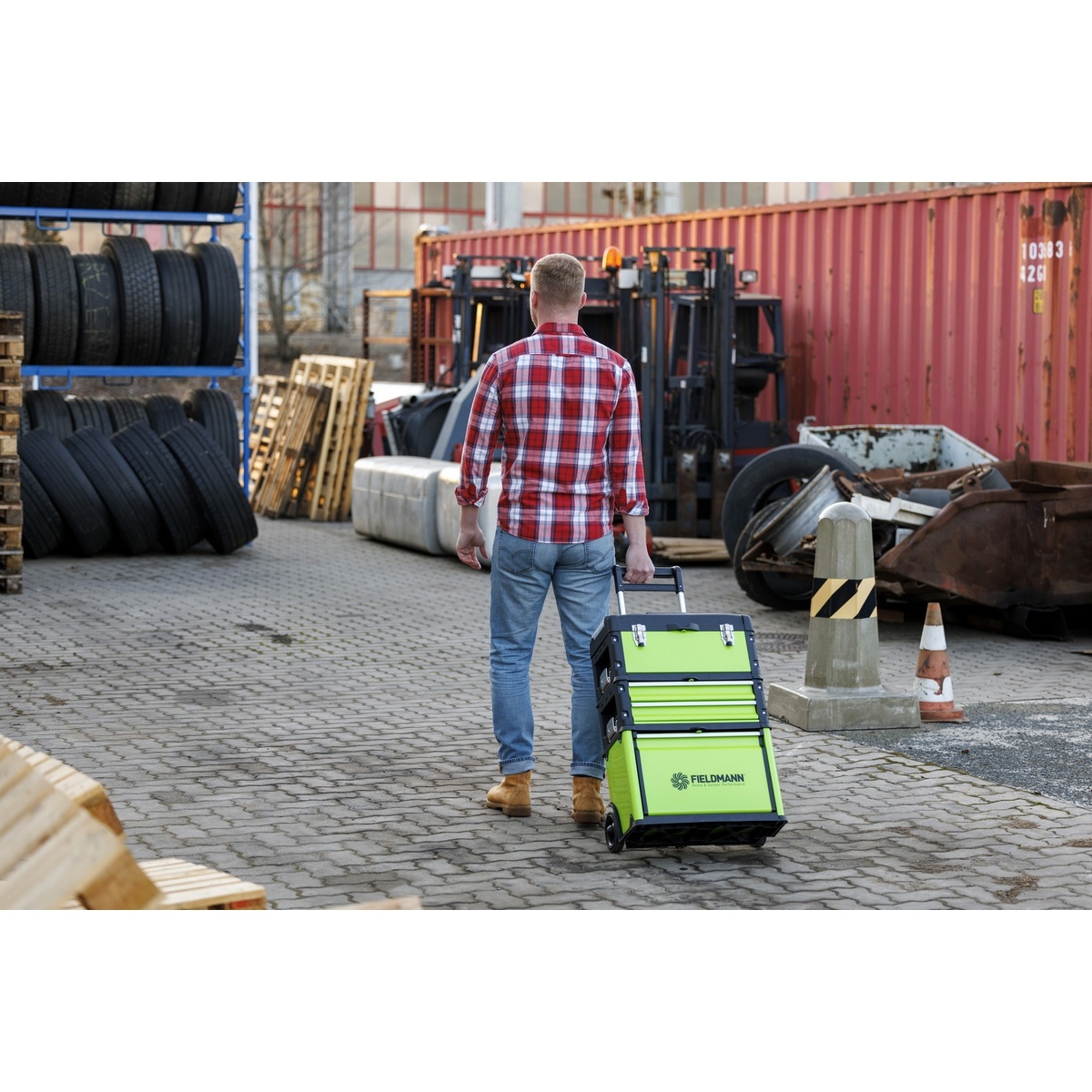 Třídílný box na nářadí FDN 4150, je vyrobený z kovu, má tedy bytelnou konstrukci, která zajistí odolnost i bezpečí pro uložené věci. S jeho pomocí snadno, rychle a bez větší námahy dopravíte množství nástrojů, příslušenství a drobného materiálu i na větší vzdálenosti např. na chalupu, na stavbu apod.Jednotlivé části boxu jsou členěny tak, aby měl každý nástroj či materiál své místo a uživatel nemusel ztrácet čas zdlouhavým hledáním. V menších přihrádkách ve víku horního boxu uložíte drobný, např. spojovací materiál, o kterém budete mít perfektní přehled díky krytu z průhledného pevného plastu. Vyjímatelná plastová přihrádka s rukojetí pak pojme další drobnosti a nářadí a v boxu zbyde ještě dost prostoru na větší nástroje. Druhý díl nabízí dvě výsuvné zásuvky s dostatkem místa např. pro sadu nejčastěji používaných šroubováků nebo klíčů.Spodní díl – velký úložný box s výklopným víkem – pak poskytuje opravdu velkorysý prostor pro pomocníky větších rozměrů, jakými jsou elektrický šroubovák, vrtačka, bruska apod. Všechny tři boxy jsou opatřeny vyklápěcími madly, aby je bylo možné přenášet i jednotlivě. Každý z nich je po stranách vybaven také bytelnými přezkami, kterými se mezi sebou vzájemně propojí v jeden pevný celek, aby byla zajištěna stabilita i bezpečnost celé sady při převážení. Robustní teleskopické madlo poslouží při převozu, při manipulaci s jednotlivými částmi ale nebude překážet. Kolečka z tvrzeného plastu zaručují dlouhou životnost celého boxu.