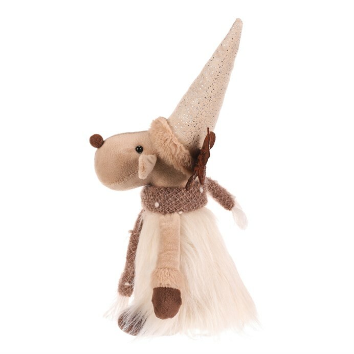 Látkový sob v béžovo-hnědém oblečení dodá vašemu domovu hřejivou zimní atmosféru a rozzáří každé místo, kam ho postavíte. Jeho jemné barevné ladění, měkký kožíšek a výrazné parůžky vytvářejí útulný a přátelský vzhled, který se skvěle hodí do vánoční výzdoby.Sob je vyroben z kvalitního textilu, který je hebký na dotek, a doplněn o detaily jako špičatá čepice, teplá šála nebo měkké rukavičky. Výška 32 cm z něj dělá ideální dekoraci na stůl, polici, komodu nebo pohovku, kde vnese radost a pohodu.Díky svému milému výrazu a decentnímu barevnému provedení zapadne do každého interiéru. Potěší i jako dárek pro všechny, kteří mají rádi zimní dekorace s osobitým kouzlem.Hlavní výhody produktu: hebké a kvalitní textilní provedení přírodní odstíny béžové a hnědé roztomilý vzhled s výraznými parůžky vhodný pro postavení na různé povrchy ideální jako zimní dekorace i dárekParametry a specifikace: materiál: textil výška: 32 cm barva: béžová, hnědá provedení: stojící použití: interiér