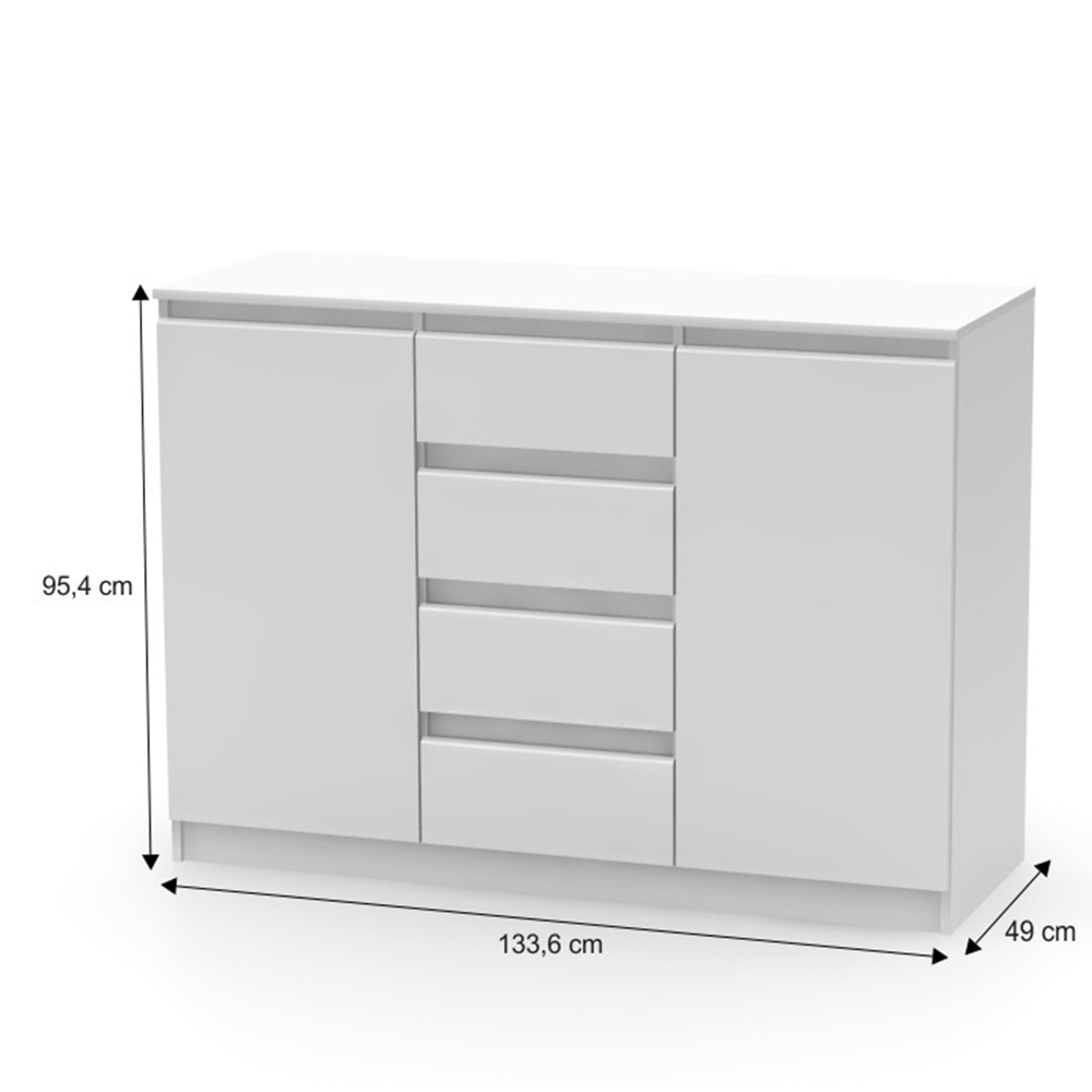 Komoda HANY NEW 010, bílá, je prostorným a nadčasovým úložným řešením, které se díky svému čistému bílému provedení snadno začlení do každé místnosti – od ložnice přes obývací pokoj až po dětský pokoj. Nabízí kombinaci čtyř zásuvek uprostřed a dvou bočních skříněk s policemi, takže poskytuje opravdu velkorysý a přehledný úložný prostor pro oblečení, dokumenty, doplňky i další domácí potřeby. Vyrobena je z kvalitní laminované dřevotřísky s ABS hranami, které zajišťují vyšší odolnost a dlouhou životnost. Minimalistické provedení bez viditelných úchytek působí elegantně a moderně, díky čemuž komoda snadno oživí i jednoduše zařízený interiér.Parametry: materiál: DTD laminovaná barva: bílá rozměry: 133,6 × 49 × 95,4 cm počet zásuvek: 4 boční dvířka s policemi ABS hrany snadná údržba dodáváno v demontu