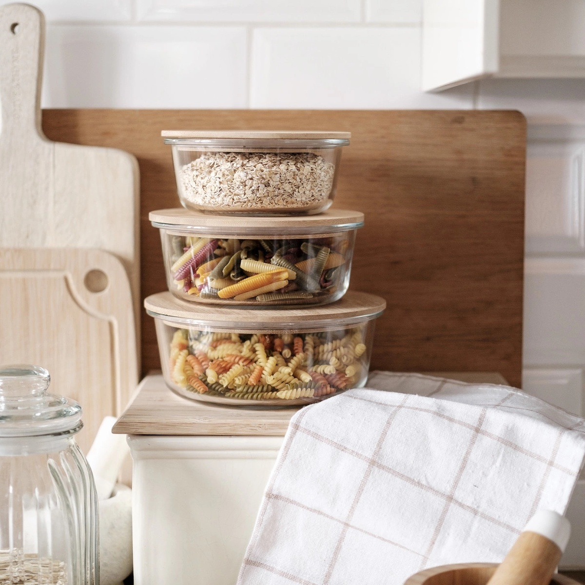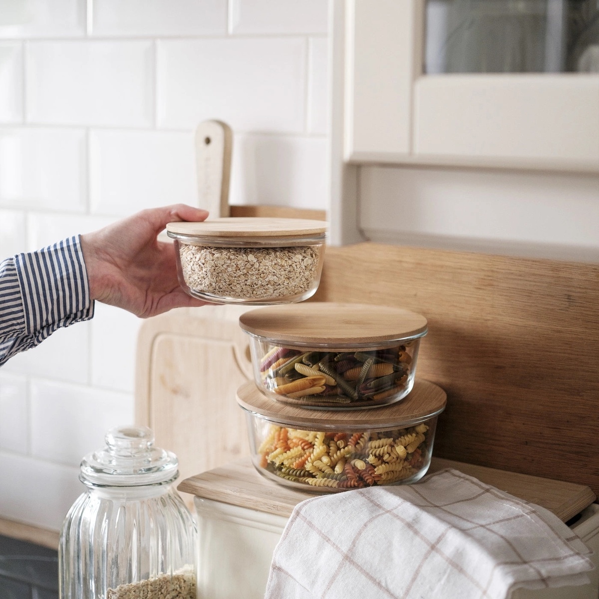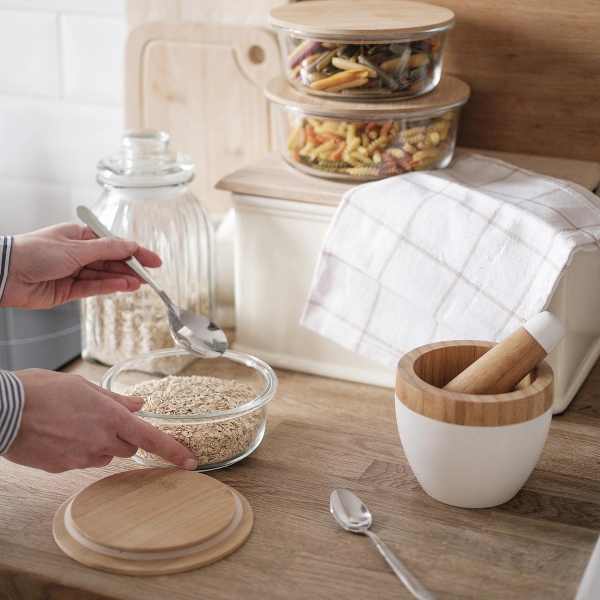 Trápí vás plýtvání jídlem? Uchovejte zbytky ze snídaně, oběda nebo večeře ve skleněné dóze s bambusovým víkem Clavato. Těsně uzavíratelná, účinně chrání potraviny před vysycháním a vlhkostí. Nádoba je ideální i pro skladování uzenin a sýrů, čímž zabrání ztrátě chuti a vůní. Dóza má objem 640 ml a je vyrobena z borosilikátového skla, které neobsahuje škodlivé sloučeniny a je vysoce odolné vůči teplotám.Proto ji můžete použít nejen k ukládání potravin v chladničce nebo mrazáku, ale také k ohřevu jídel v mikrovlnné troubě nebo pečení v troubě (až do 200 °C). Nádoba je pevně uzavíratelná díky víku z bambusového vlákna, které je 3krát odolnější než bukové dřevo. Víko lze také použít jako podložku pro teplé pokrmy.Nádoba je odolná proti poskvrnění a poškrábání, takže ji lze mýt v myčce na nádobí. Bambusové víko doporučujeme umývat hadřičkou.