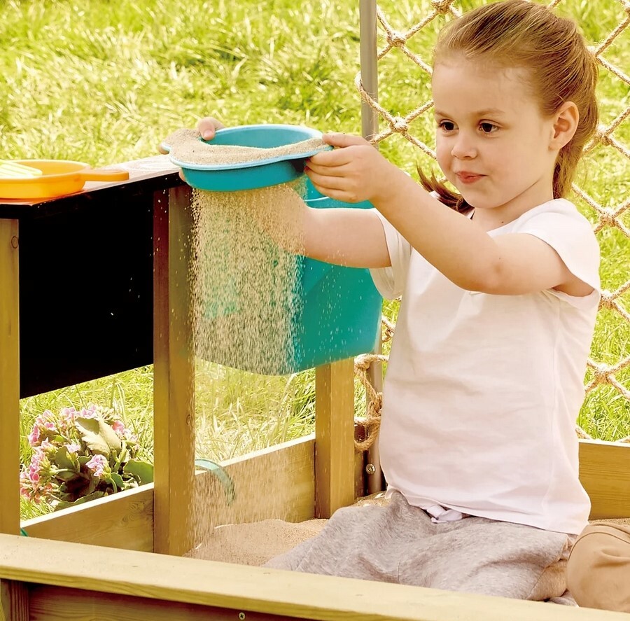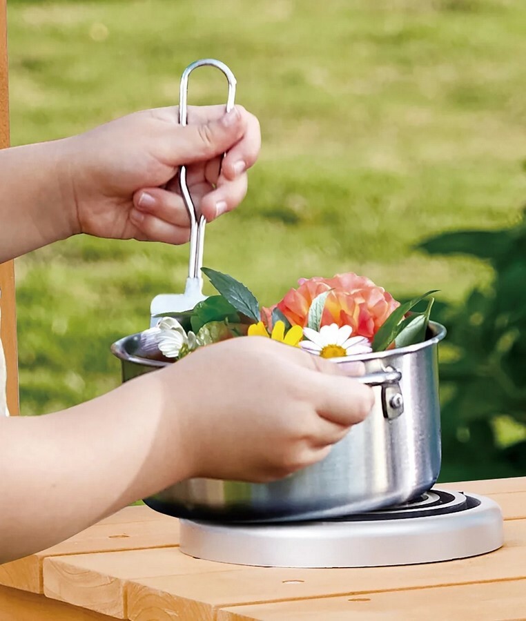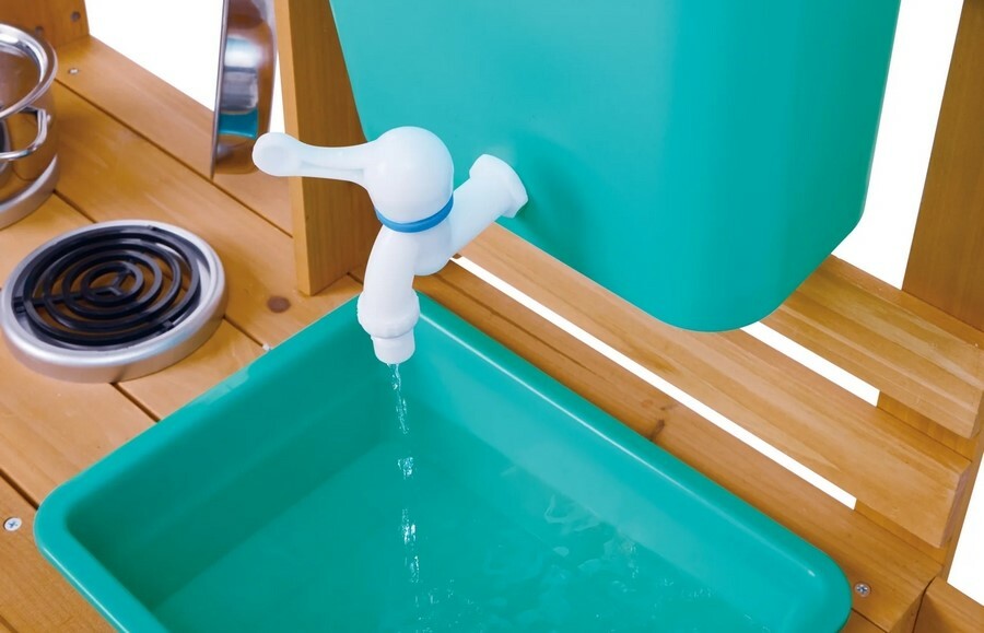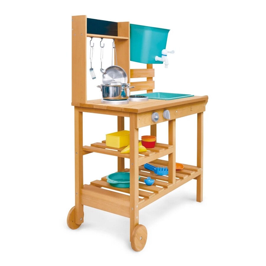 Dřevěná venkovní kuchyňka s doplňky je skvělým místem pro malé kuchaře, kteří rádi experimentují s vodou, pískem i přírodninami. Tato prostorná kuchyňka nabízí realistické detaily, které podněcují dětskou fantazii od funkčního kohoutku s nádobou na vodu až po odnímatelný dřez a varnou zónu pro „přípravu“ těch nejlepších venkovních pokrmů.Konstrukce je vyrobena z kvalitního FSC certifikovaného dřeva, které je odolné vůči venkovním podmínkám. Díky kolečkům lze kuchyňku snadno přesunout kamkoli, kde se děti chtějí pustit do vaření. Dvě odkládací police poskytují dostatek místa na nádobí a ingredience, zatímco přiložené náčiní, hrnec, pánev i kelímky doplňují realistický zážitek ze hry.Kuchyňka rozvíjí motoriku, tvořivost, smysl pro spolupráci i zodpovědnost, když se děti střídají v rolích kuchaře, pomocníka či hosta. Ideální pro hru venku i v dětském koutku na terase.Hlavní výhody produktu realistická dřevěná venkovní kuchyňka s bohatým příslušenstvím funkční kohoutek s nádobou na vodu a odnímatelný dřez pevná konstrukce z FSC dřeva odolná pro venkovní použití rozvíjí fantazii, motoriku a sociální dovednosti snadná manipulace díky kolečkůmObsah balení 1× dřevěná kuchyňka s kolečky 1× nádoba s kohoutkem 1× odnímatelný dřez 1× pracovní miska 1× hrnec s pokličkou 1× pánev 1× cedník 1× naběračka 1× vařečka 1× špachtle 4× kelímek 2× lopatička 1× hrabičky 1× formička na písekParametry a specifikace materiál: FSC dřevo, kov, plast doporučený věk: 3–8 let