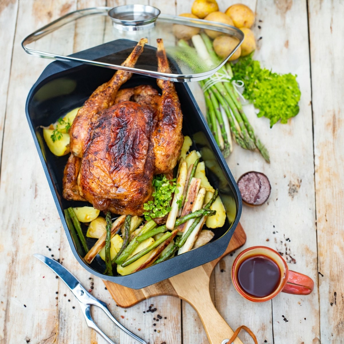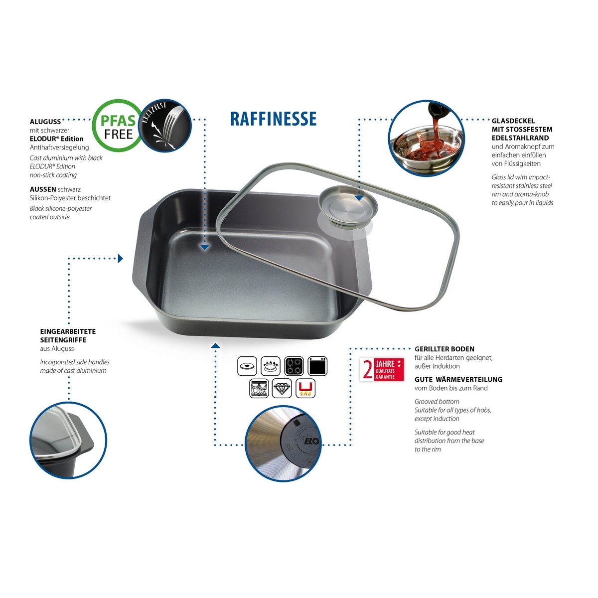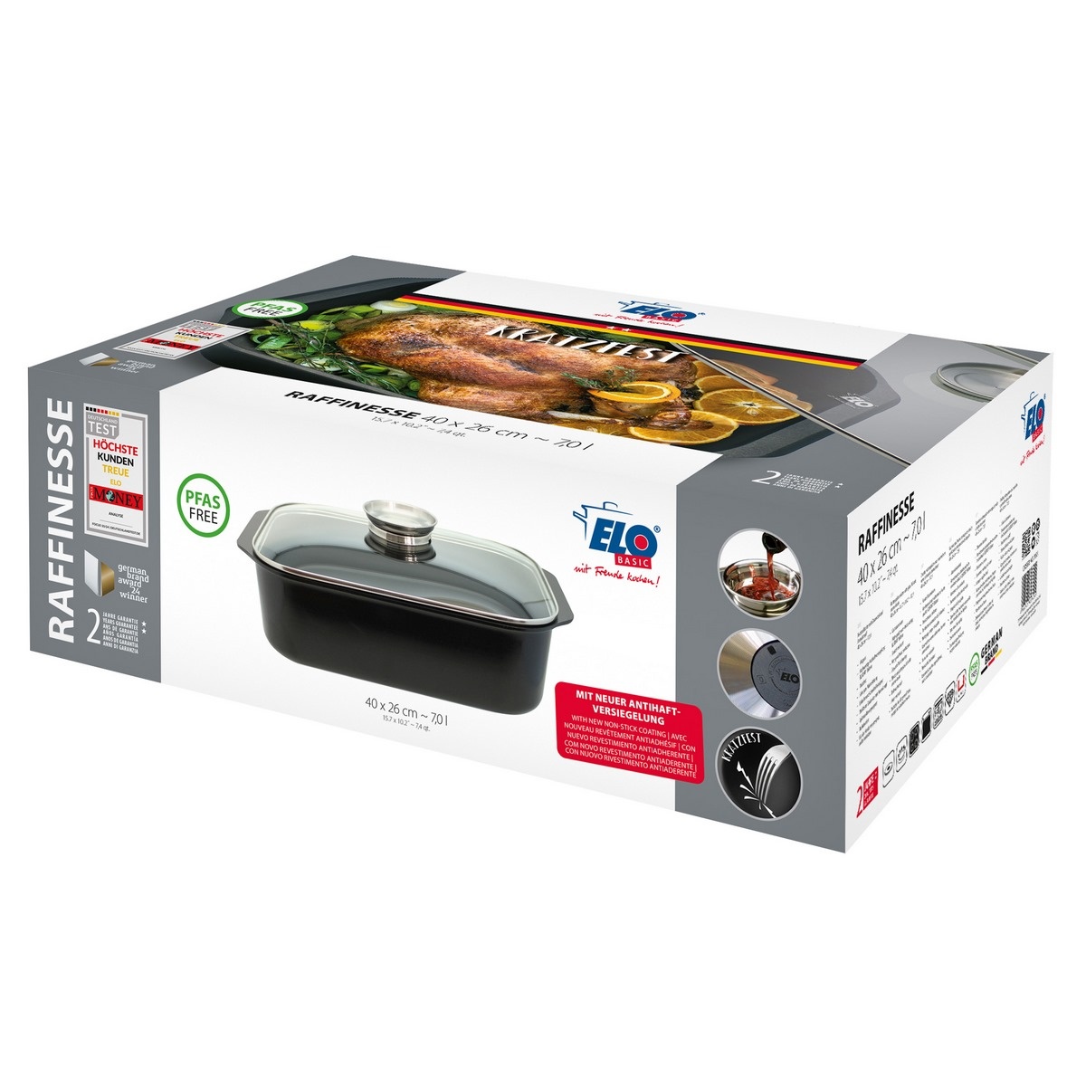 Pekáč Raffinesse od německé značky ELO je promyšleným spojením praktičnosti, kvality a moderní technologie. Vyroben je z litého hliníku a vybaven nepřilnavým povrchem ELODUR® Edition bez PFAS, takženabízí ideální řešení pro každodenní domácí vaření bez připalování. Díky rozměrům 40 x 26 cm a objemu 7 l pojme i větší množství surovin, což ocení především rodiny nebo hostitelé.Součástí je odolná skleněná poklice s aroma úchytem, která usnadňuje přidávání tekutin během přípravy pokrmů, aniž by bylo nutné víko odklápět. Tento detail pomáhá zachovat vlhkost uvnitř nádoby, což zajišťuje šťavnatý výsledek. Vnitřní povrchová úprava vyniká odolností vůči poškrábání a výborným rozvodem tepla, který sahá až ke krajům nádoby a tím šetří čas i energii.Pekáč je kompatibilní se všemi typy varných desek s výjimkou indukce a lze jej bez obav používat i v troubě do 240 °C (s poklicí do 180 °C). Snadno se čistí, lze jej mýt v myčce a jeho elegantní černý vzhled skvěle zapadne do každé kuchyně. Hlavní výhody produktu: litý hliník zajišťuje rovnoměrné rozložení tepla nepřilnavý povrch ELODUR® Edition bez PFAS a PTFE aroma úchyt umožňuje doplňování tekutin během vaření snadná údržba a odolnost vůči poškrábání velká kapacita 7 litrů vhodná pro rodinné vaření vhodné do trouby do 240 °C (s poklicí do 180 °C) kompatibilní se všemi varnými deskami kromě indukce snadné mytí v myčceObsah balení: 1x pekáč Raffinesse se skleněnou poklicí a aroma úchytem 40 x 26 cm